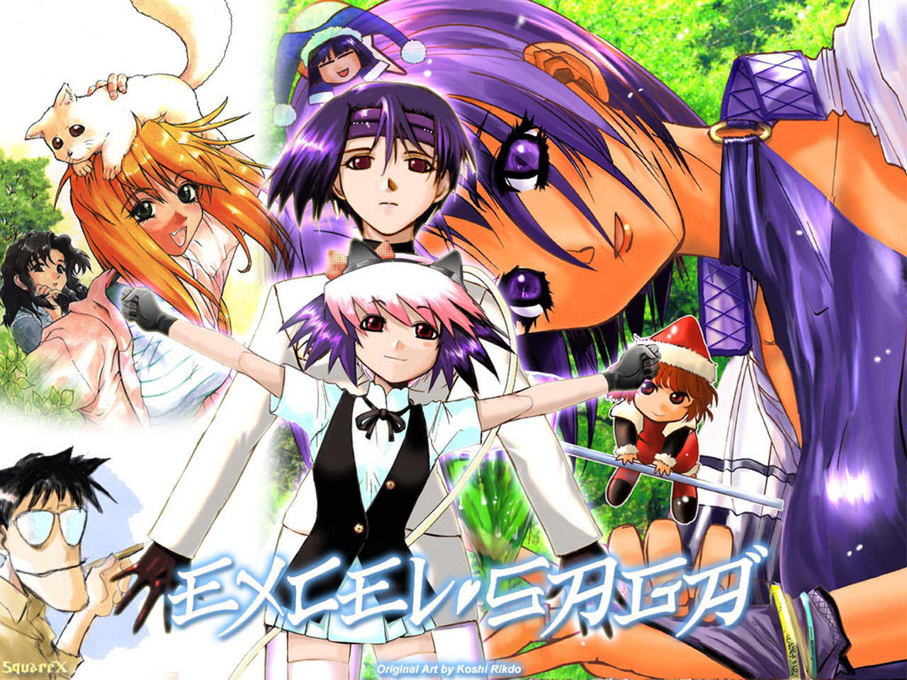 Description: A group of anime characters with their arms around each other in front of a forest and trees with the words.