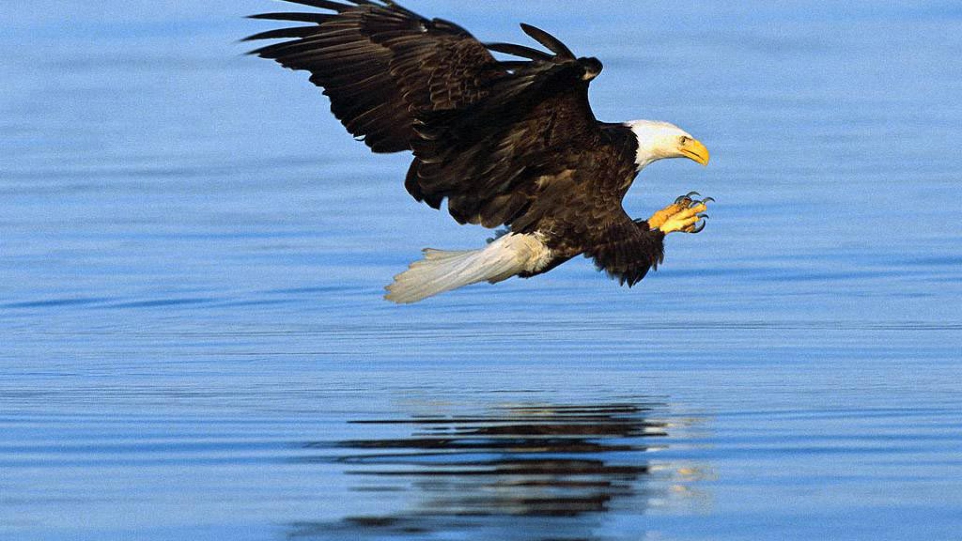 Description: A bald eagle flying over a body of water with a fish in its mouth and wings spread out.