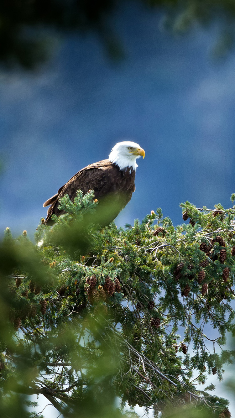 Description: A bald eagle perched on a tree branch with a blue sky in the background and a few small pine cones.