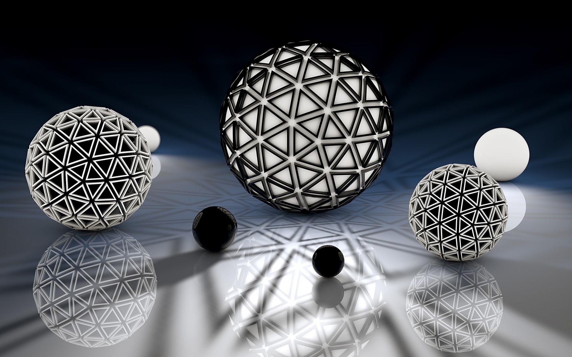 Description: A group of three balls sitting on top of a table next to each other on a reflective surface with a black and white background.