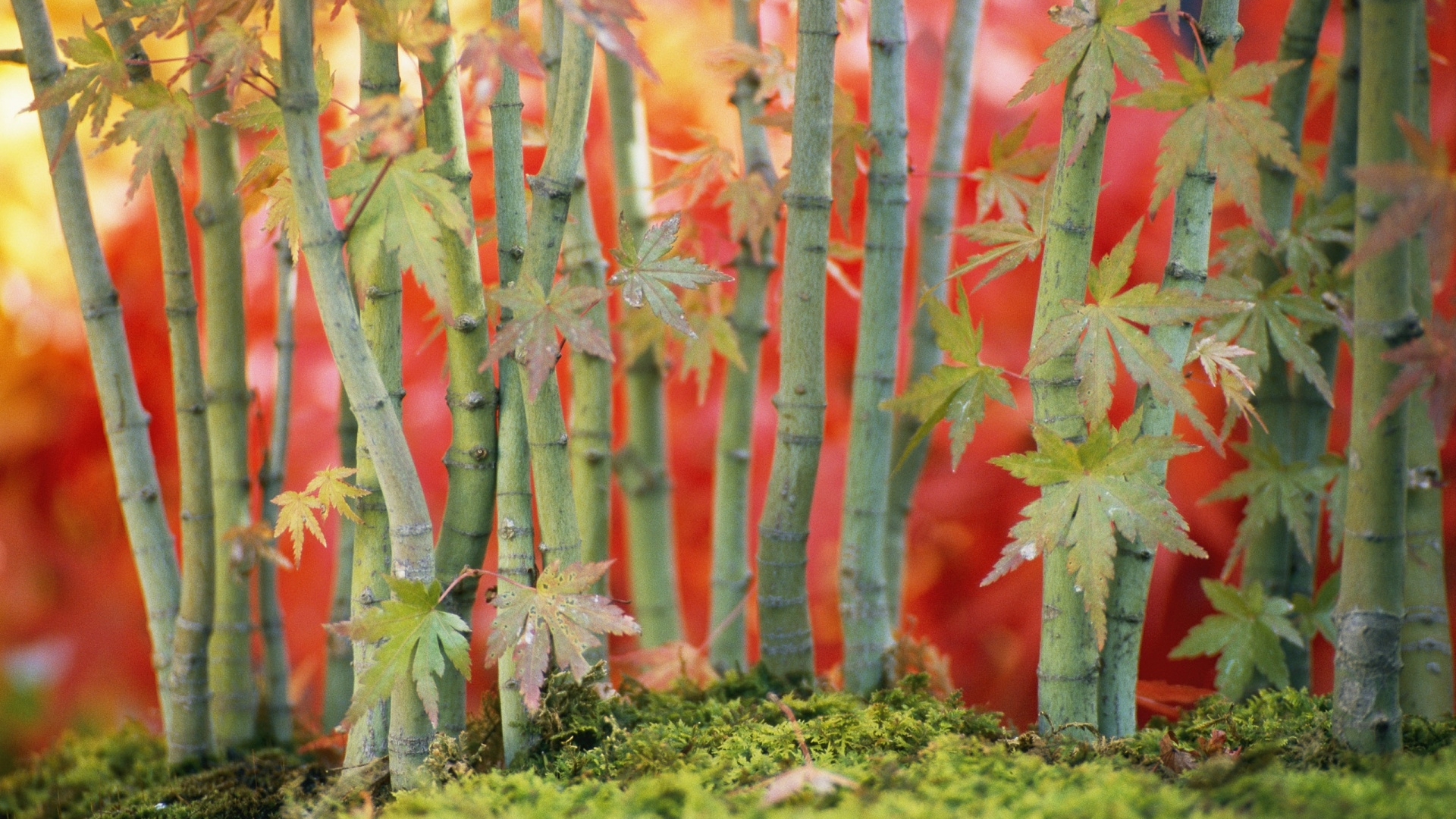 Description: A group of bamboo trees with green leaves on them and moss growing on the ground in front of a red wall.