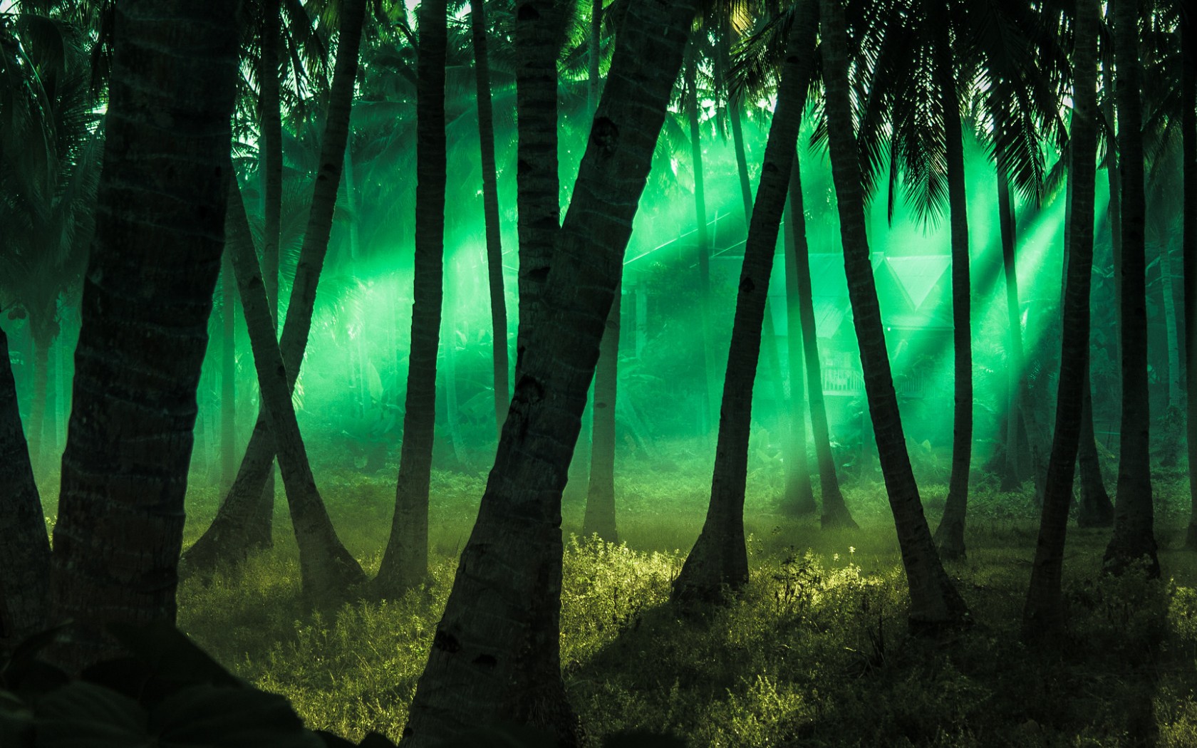 Description: A forest filled with lots of trees and green light shining through the trees on the ground and on the ground.