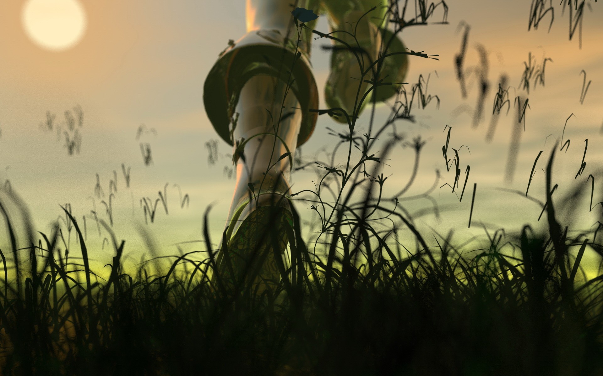 Description: A person standing in tall grass with a sky background and sun in the background with clouds in the sky.