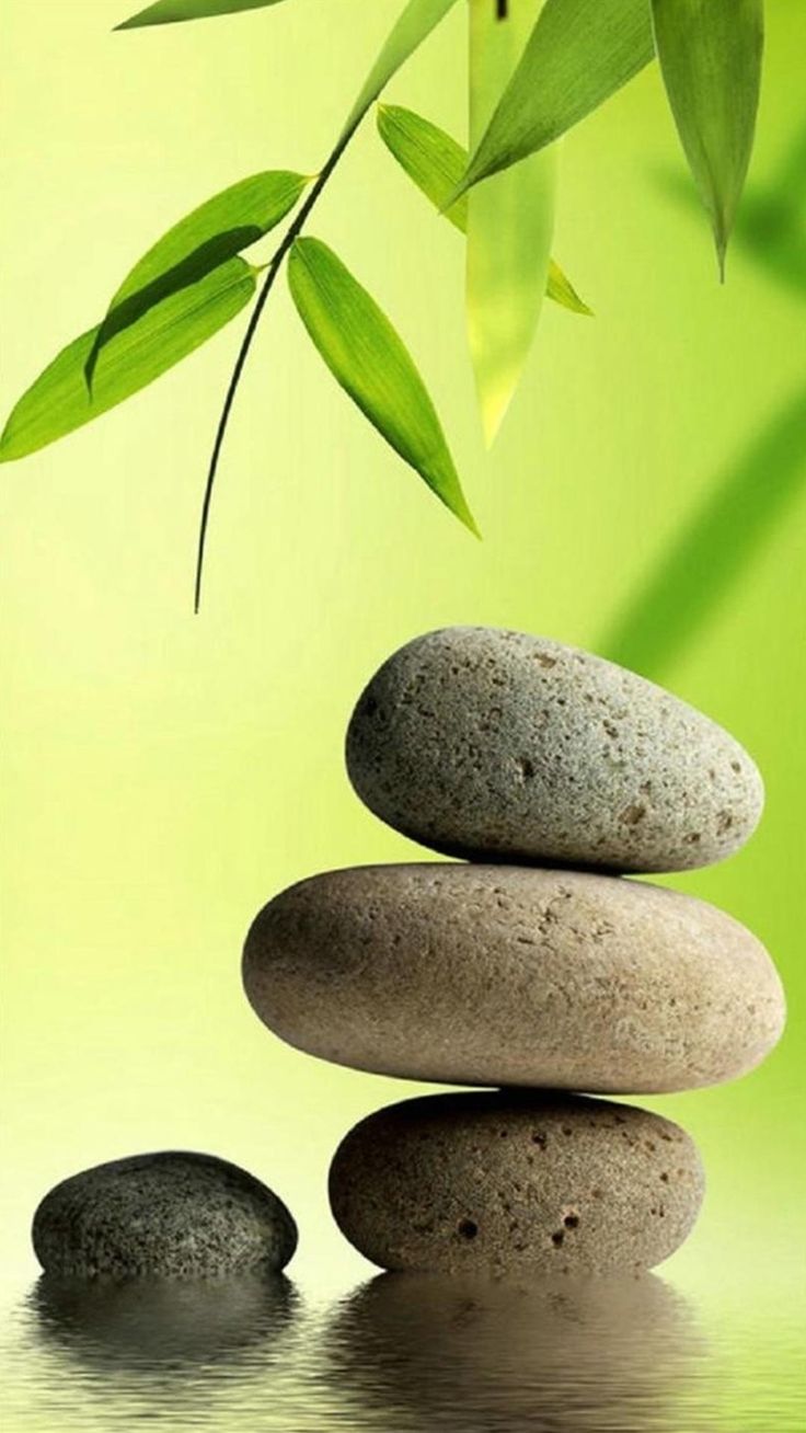 Description: A bamboo leaf is above a pile of rocks on a water surface with a bamboo leaf on top of it.