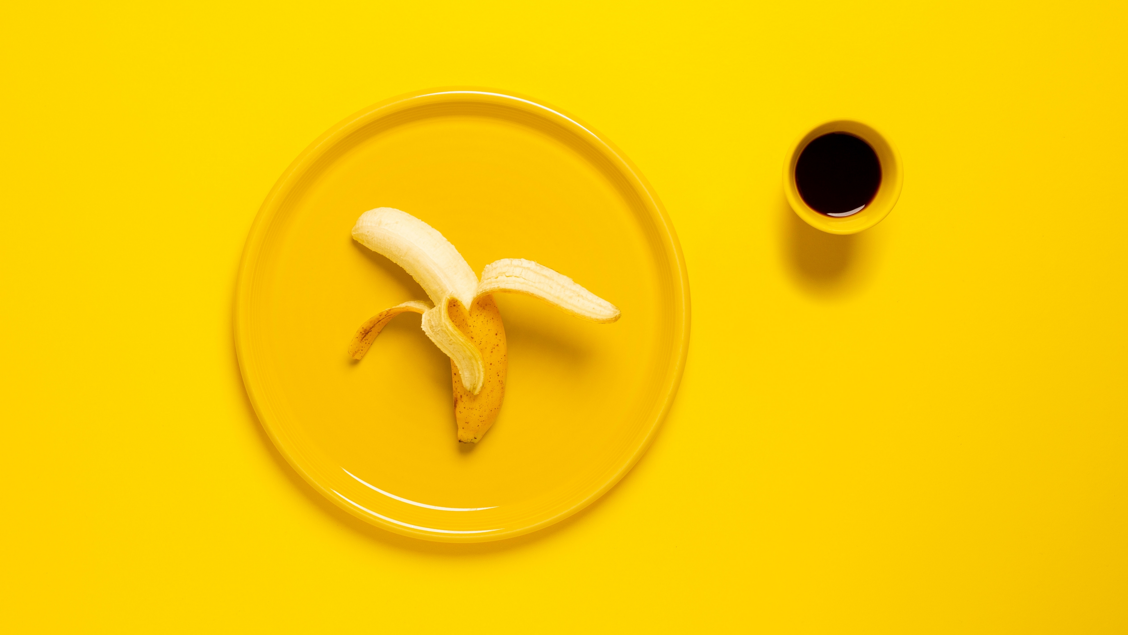 Description: A banana on a plate with a cup of coffee on a yellow background with a yellow background and a yellow background.