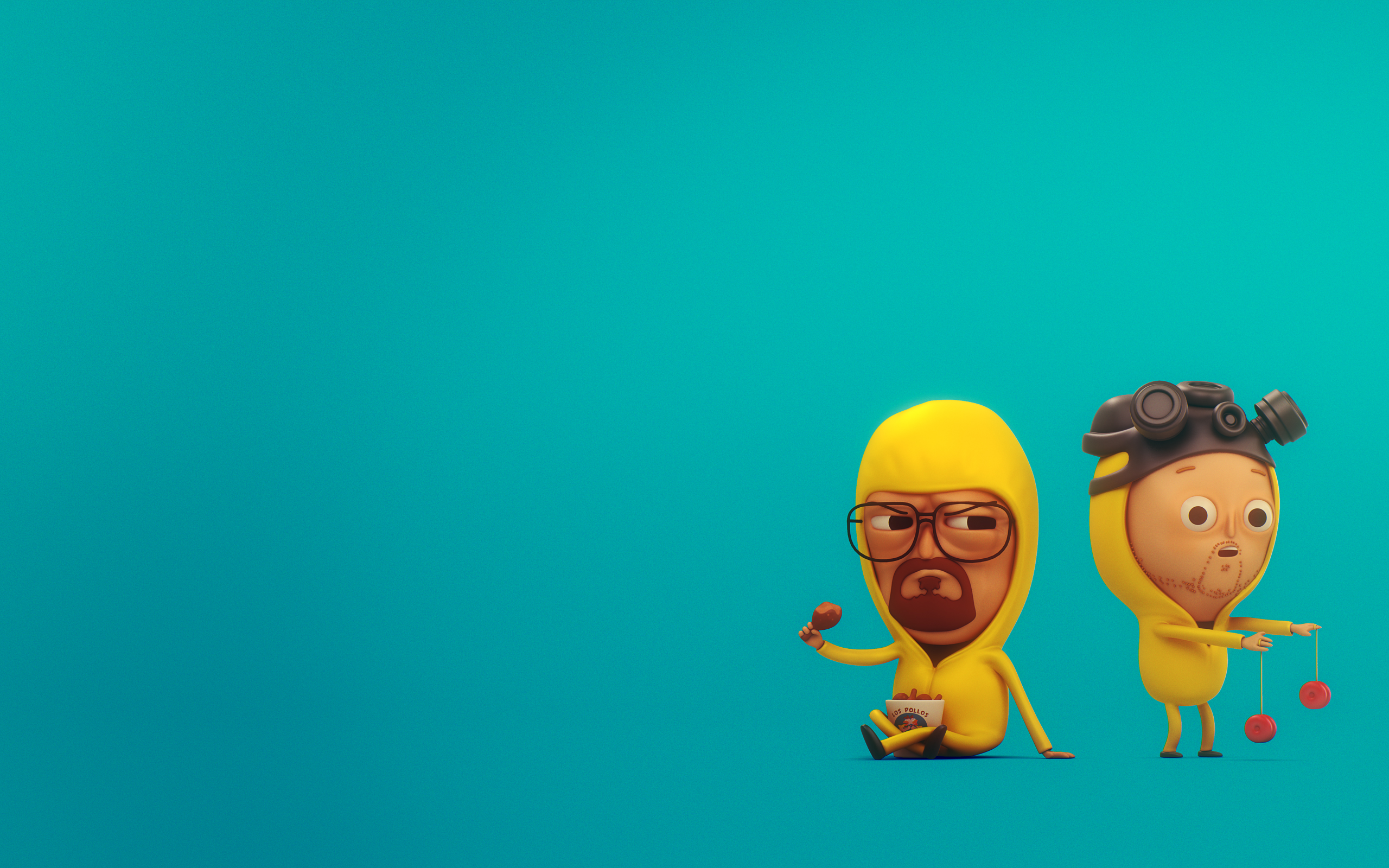 Description: A couple of bananas with a man in a yellow suit and a woman in a red dress with a black hat.