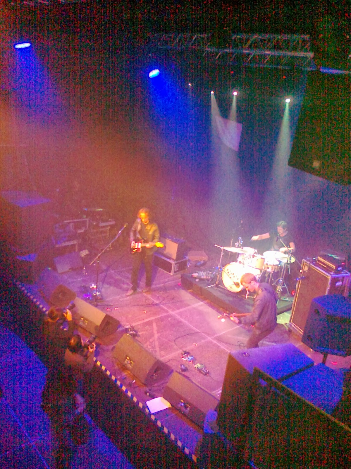 Description: A band playing on stage with blue lights and a microphone in the background with a man standing on the stage.
