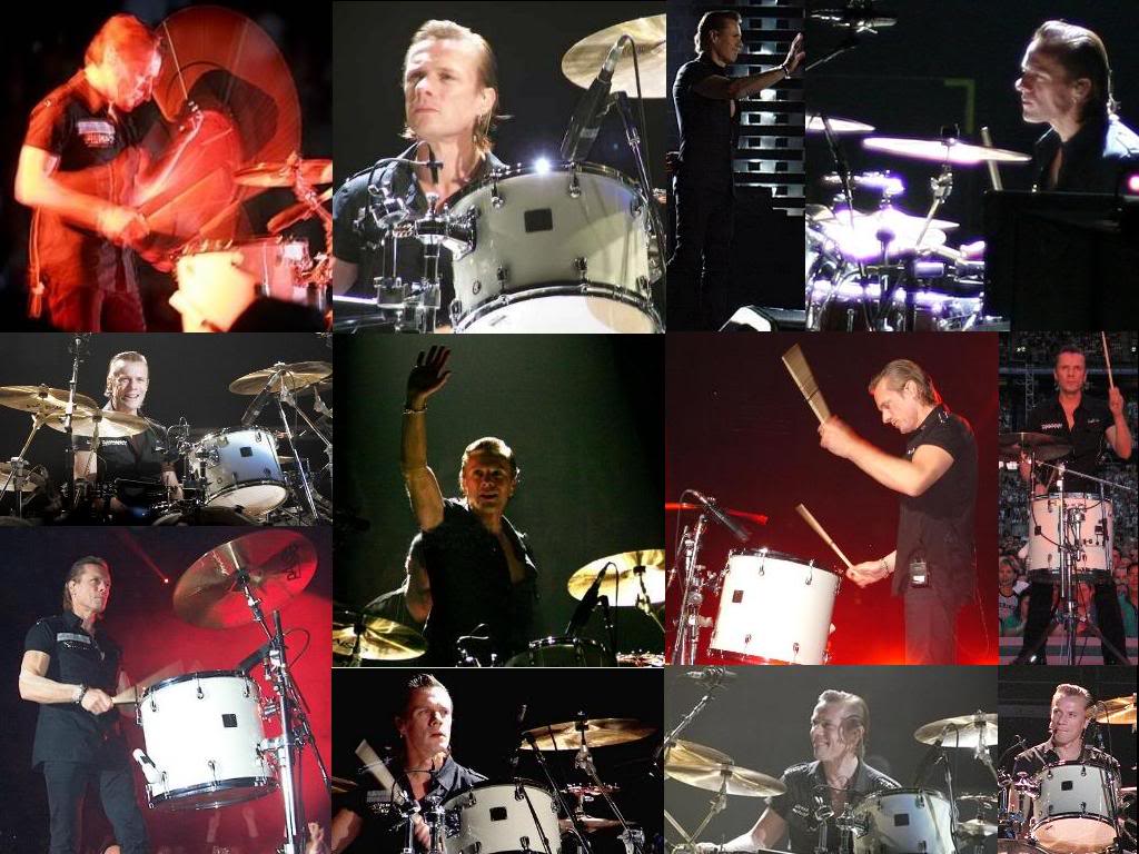 Description: A series of photos of a band playing drums and drumsticks on stage and on stage with a band member.