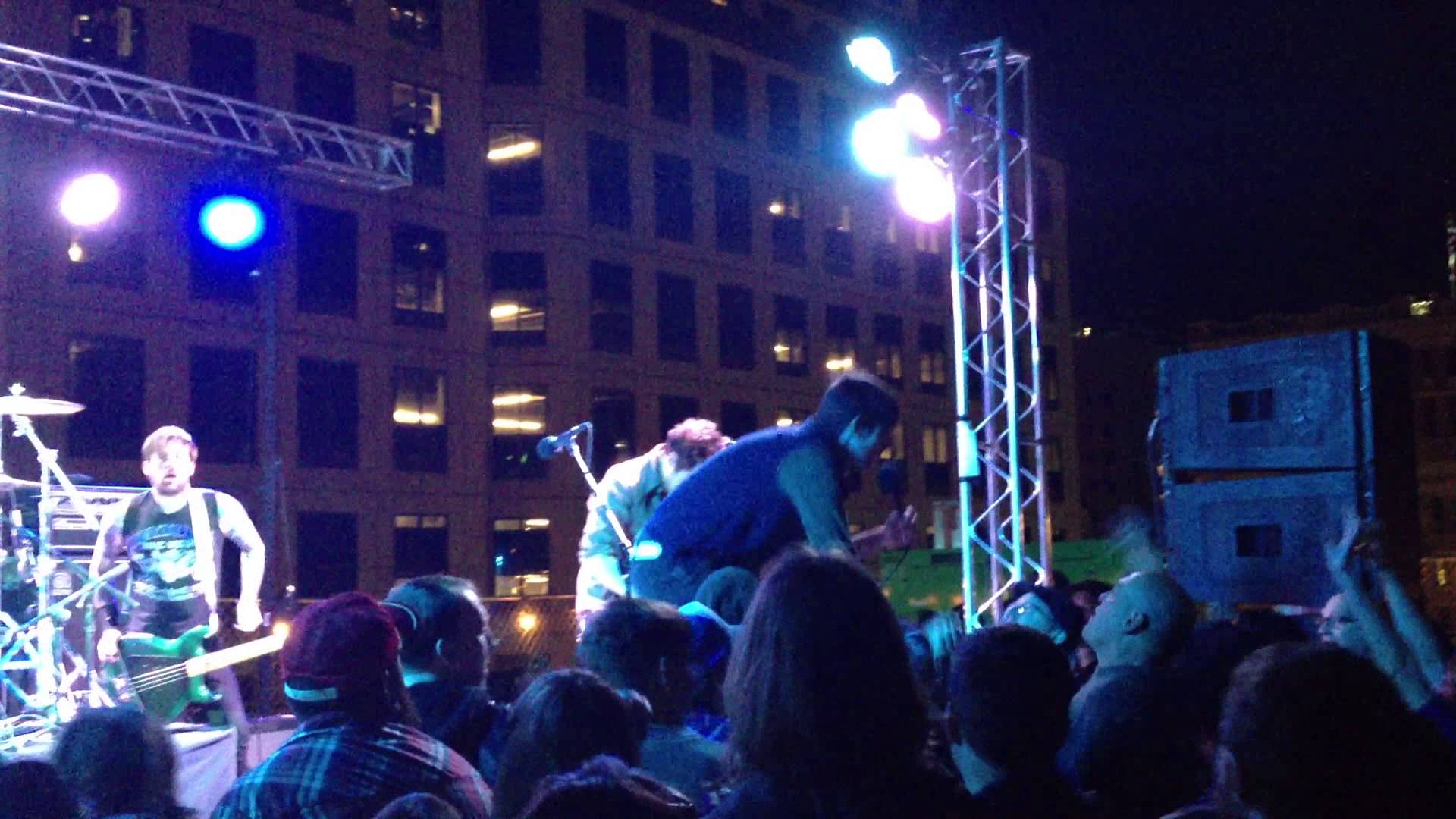 Description: A band playing on stage in front of a crowd of people at night time in a city square with lights on.