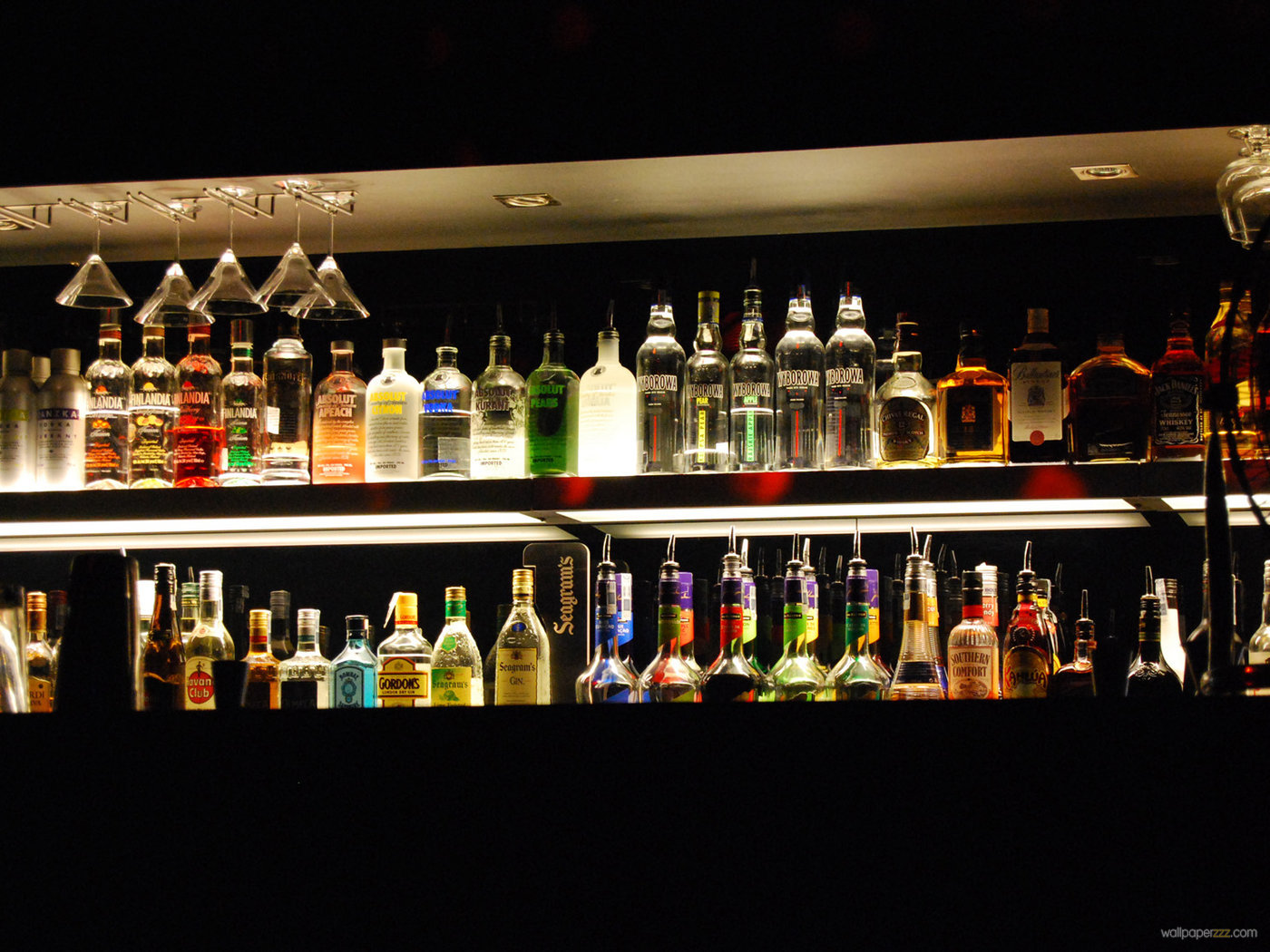 Description: A bar with a lot of bottles of liquor on it's shelves and a light on the wall.