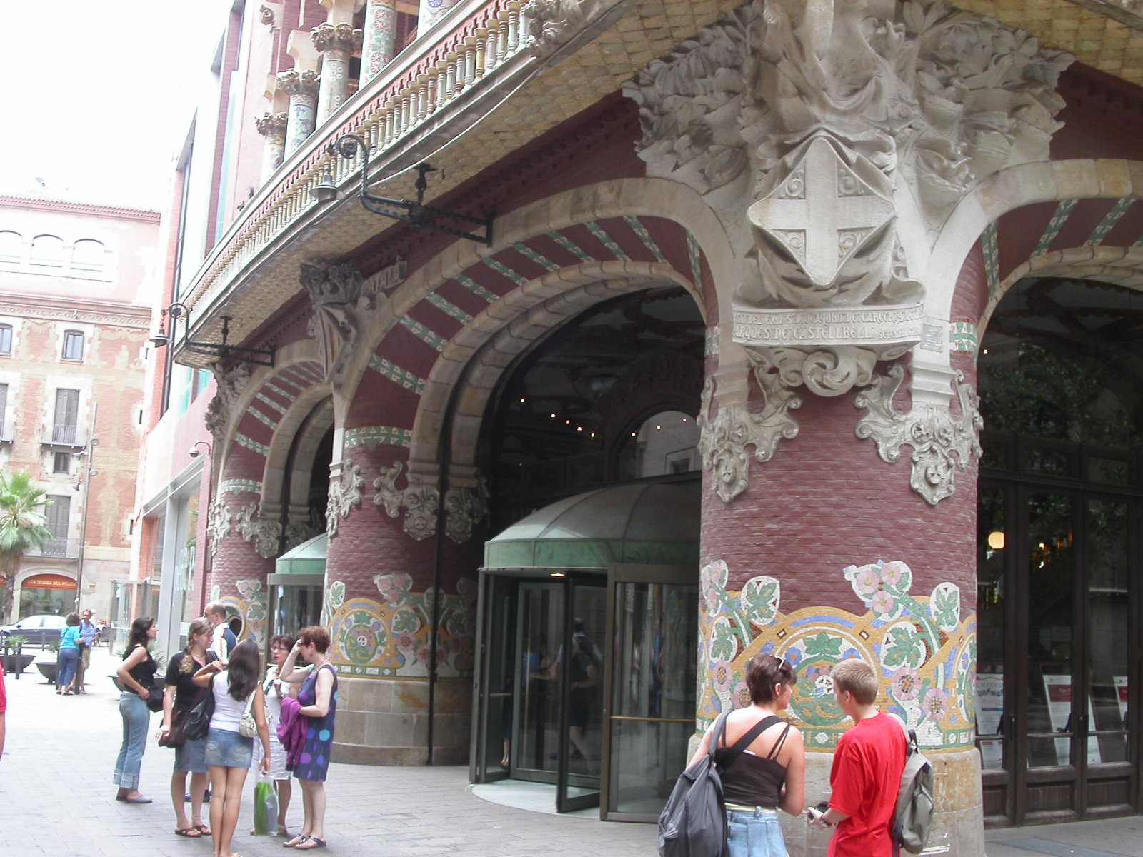 Description: A group of people standing outside of a building with a clock on the side of it's wall.