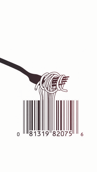 Description: A barcode with a fork and a knife on it that is black and white with a red stripe.