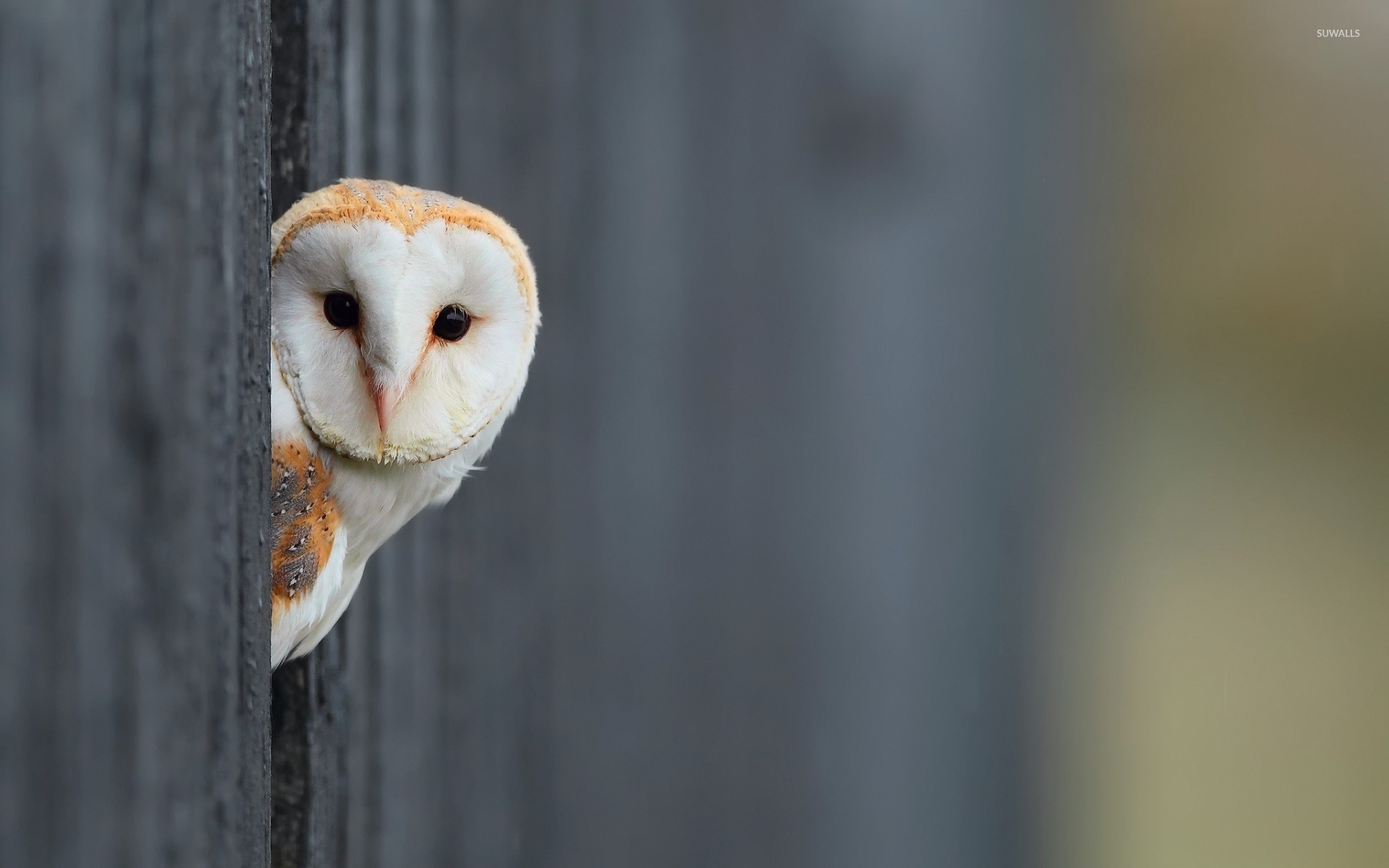 Description: A barn owl peeking out from behind a fence post with its head peeking out of the fence post.