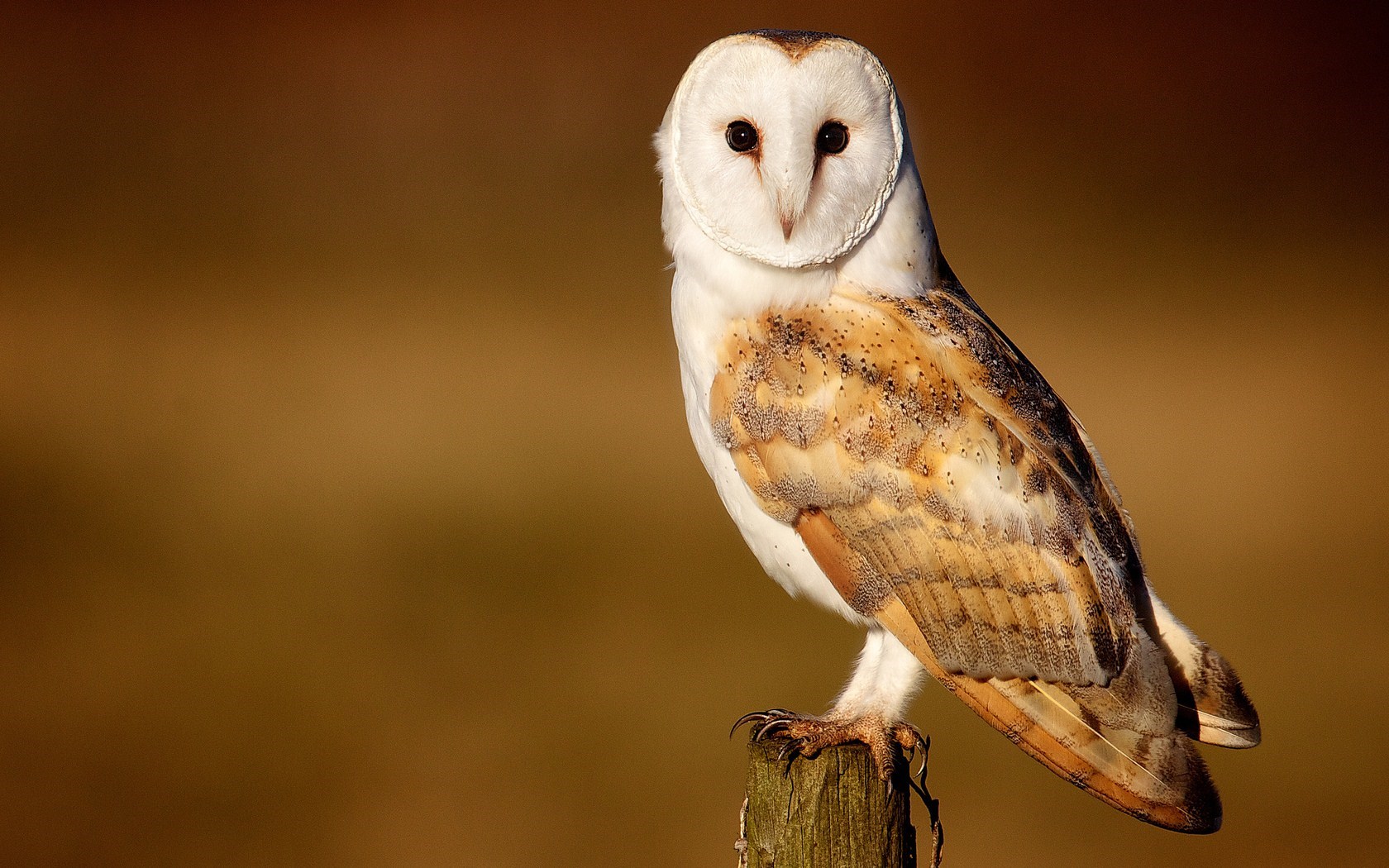 Description: A barn owl perched on a post in a field of grass and dirt.
