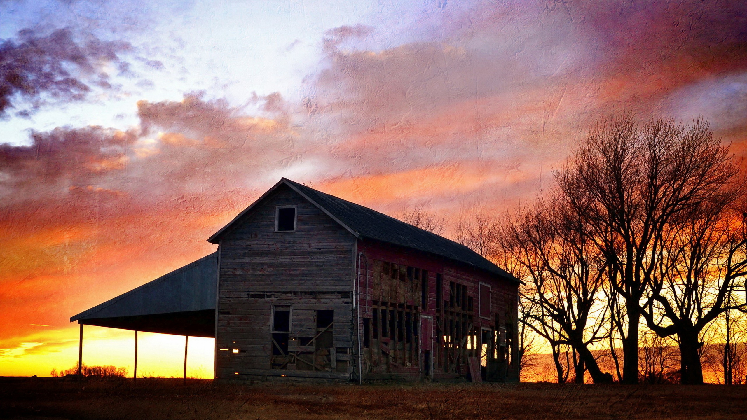 Description: A barn with a red roof and a tree in front of a sunset sky with clouds in the background.