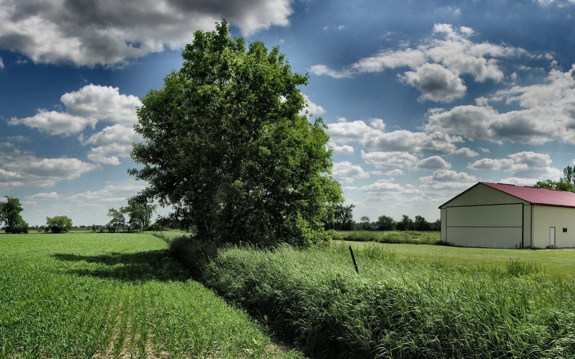 Description: A barn and a tree in a field of grass and a red roof on a farm house in the background.