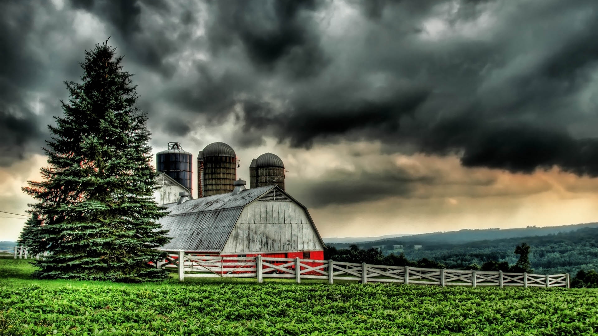 Description: A barn and a tree in a field under a cloudy sky with a red barn in the foreground.