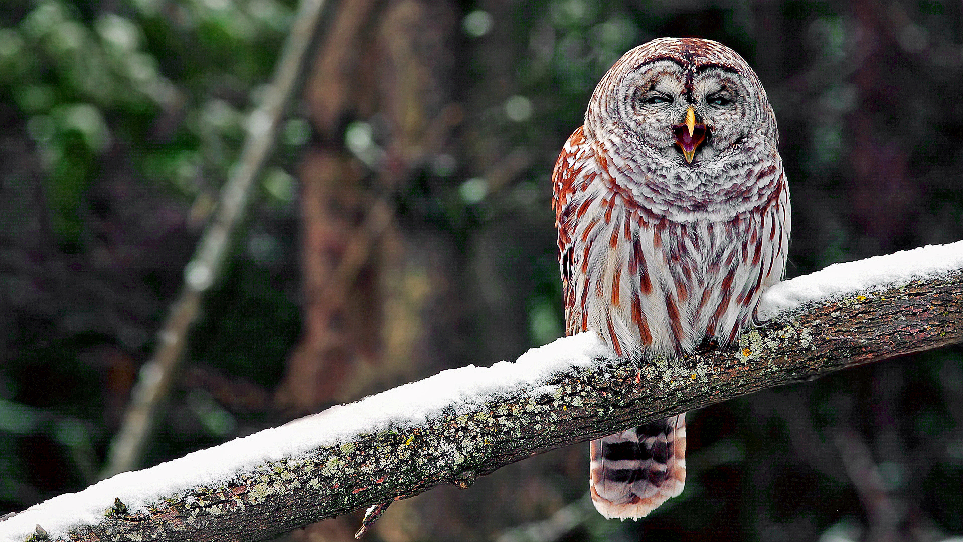 Description: A barred owl sitting on a branch in the snow with its mouth open and tongue out.