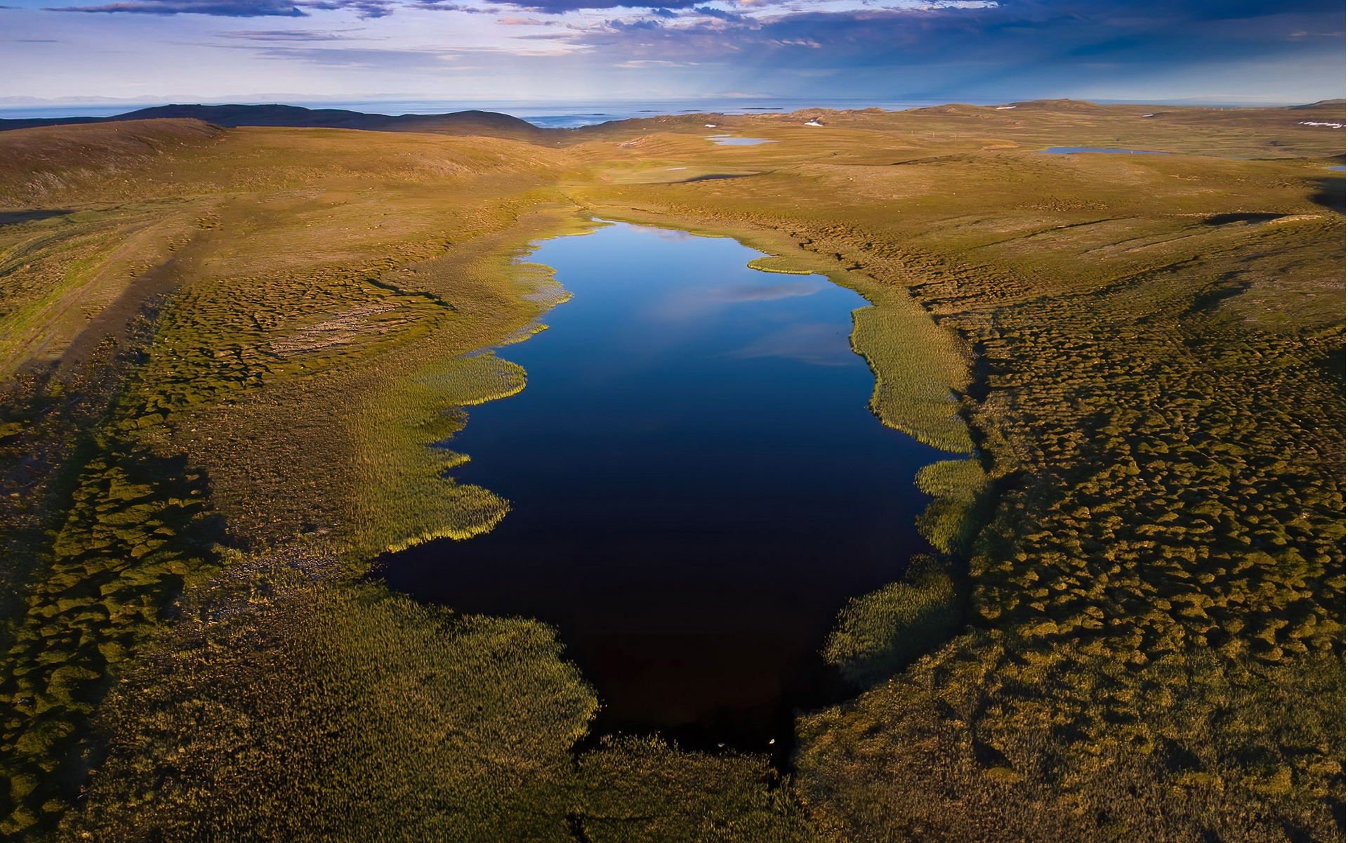 Description: A large body of water surrounded by green hills and trees in the distance is a blue sky with clouds.