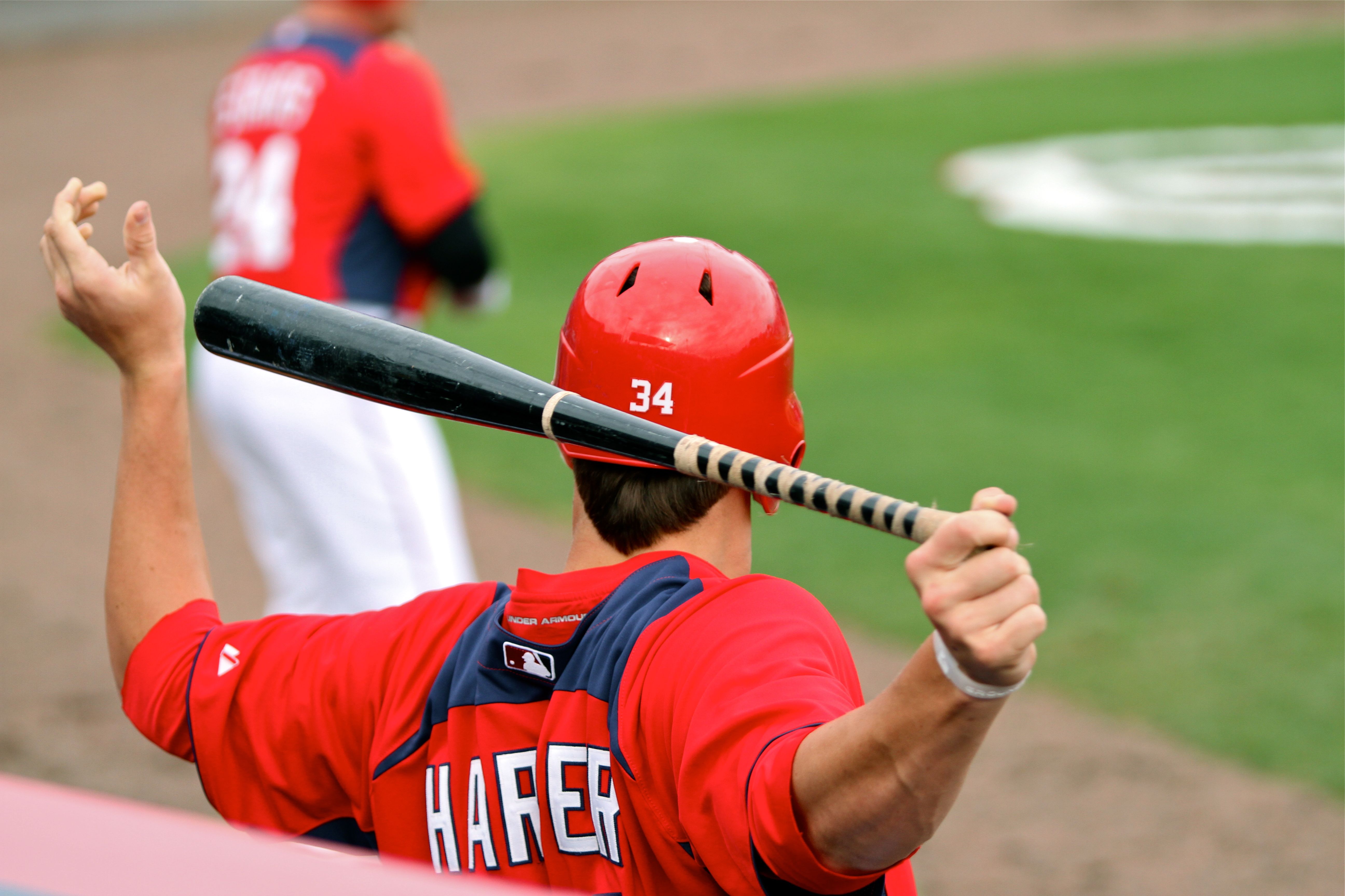 Description: A baseball player holding a bat on a field with other players in the background and grass in the background.
