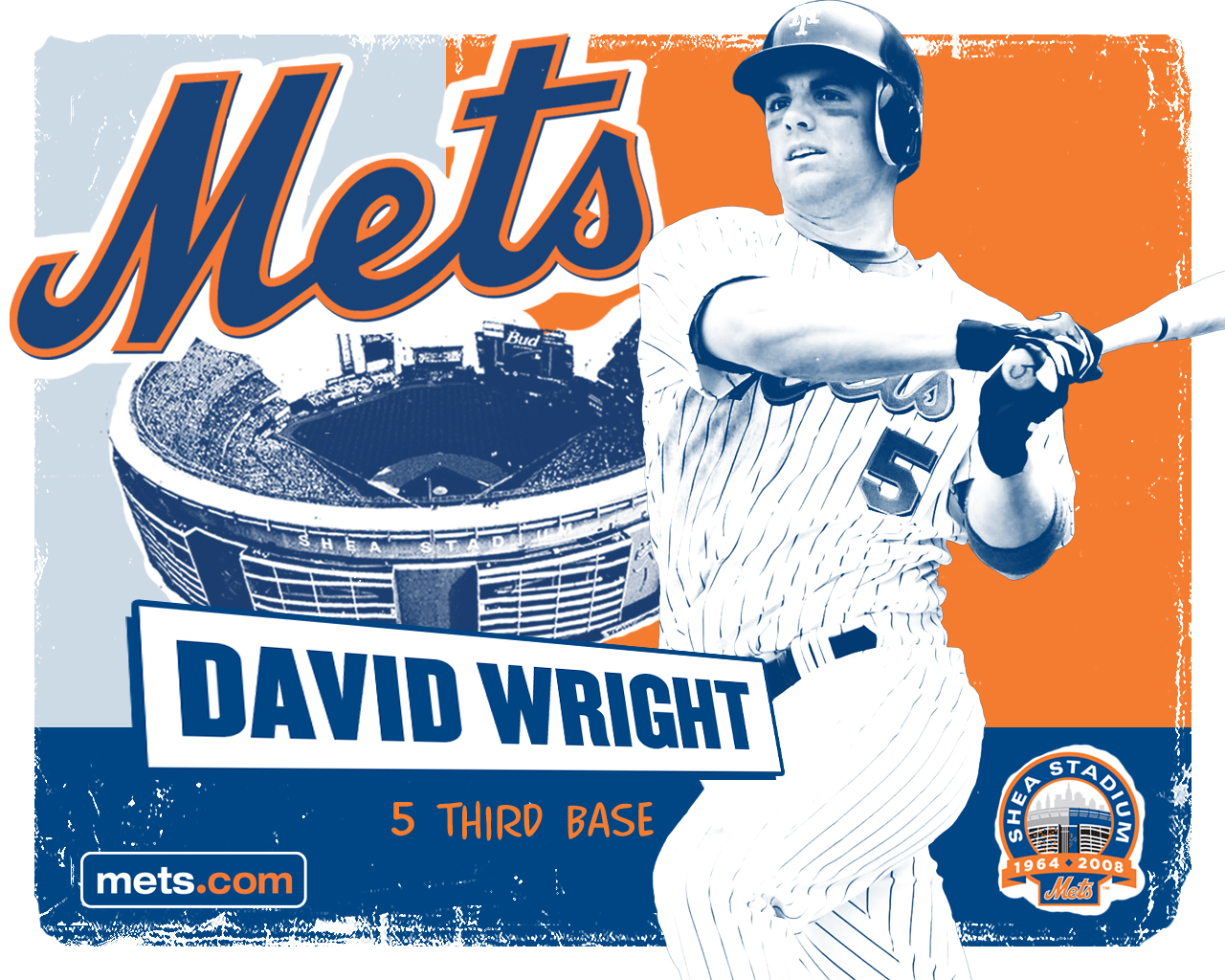 Description: A poster of a baseball player holding a bat in front of a stadium and stadium sign that reads mets.