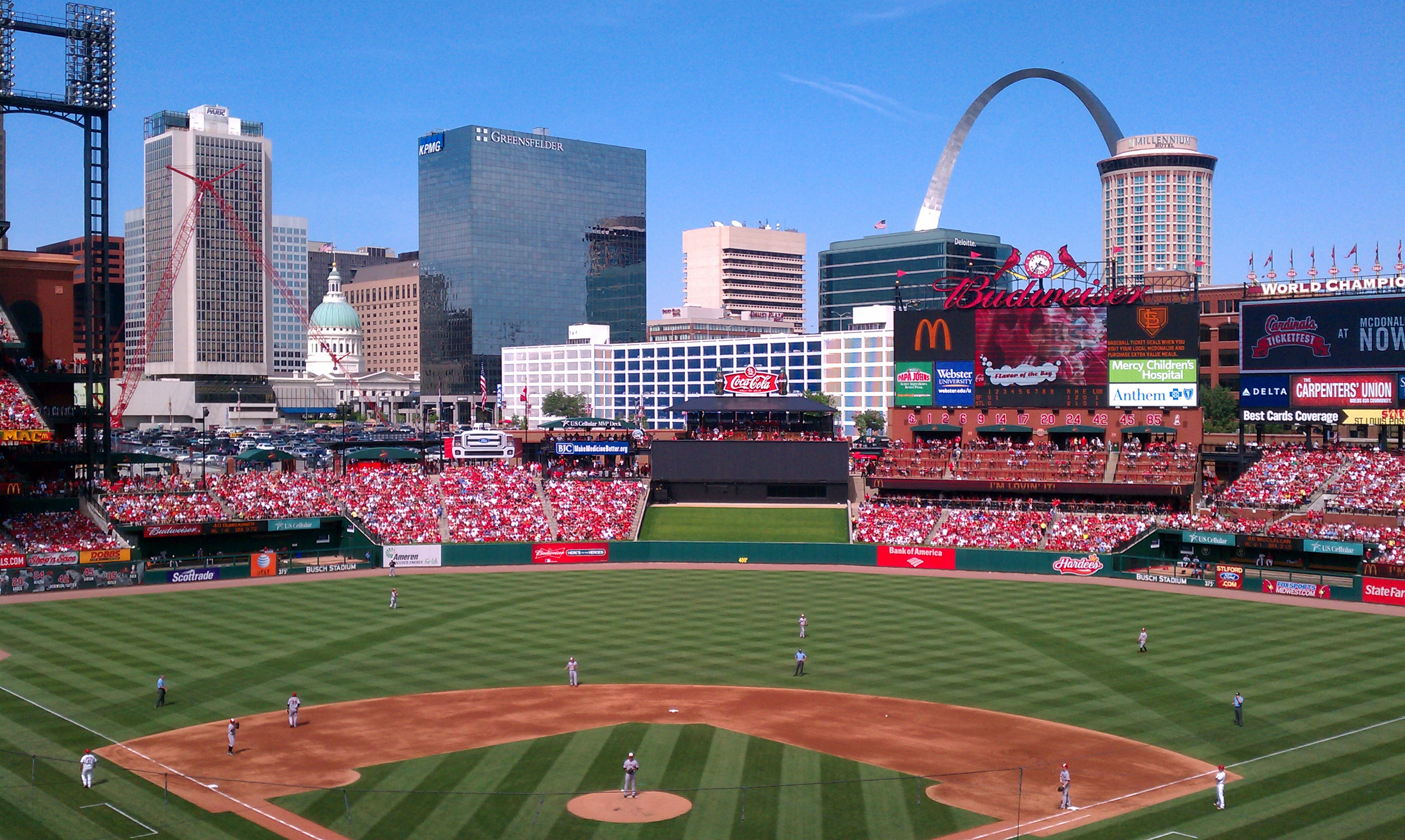 Description: A baseball stadium with a crowd of people watching it from the stands and a view of the st louis arch.