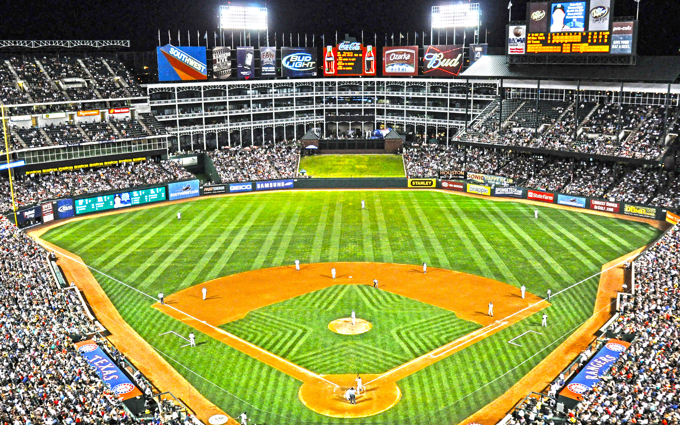 Description: A baseball stadium filled with lots of people watching a game in progress on a dark night with bright lights.