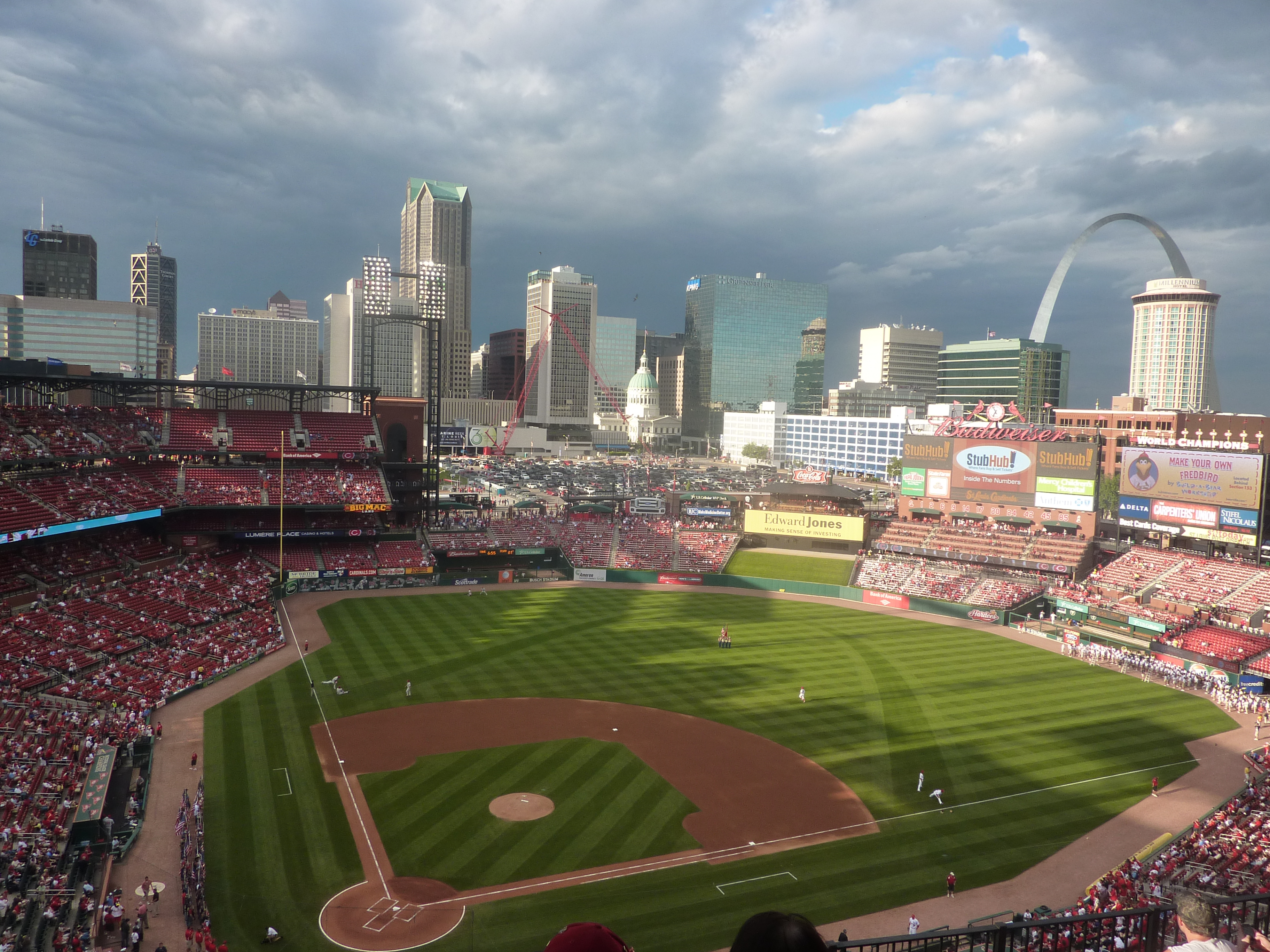 Description: A baseball stadium with a view of the st louis skyline and st louis arch in the background.