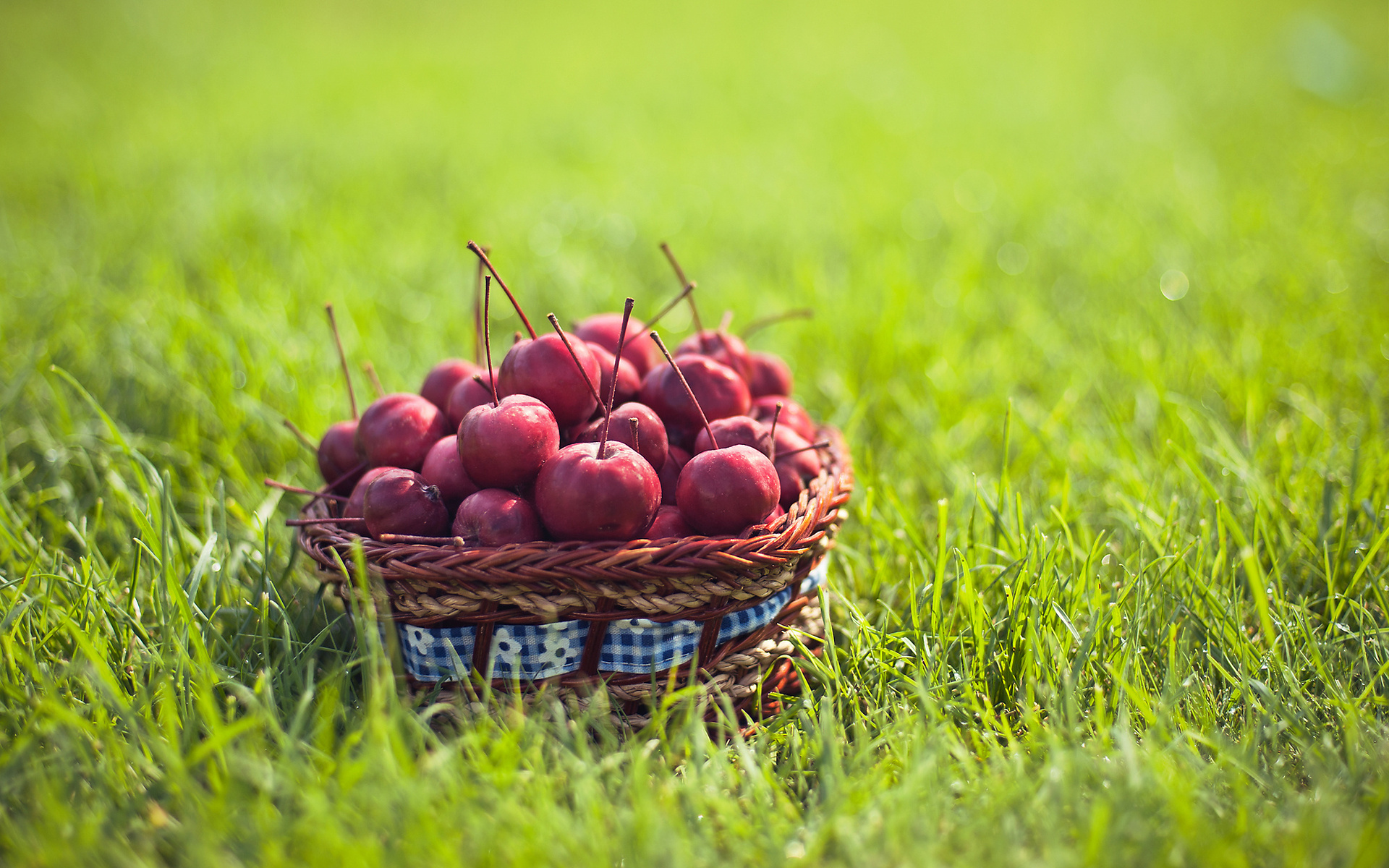 Description: A basket of apples sitting in the grass on a sunny day in the sun.