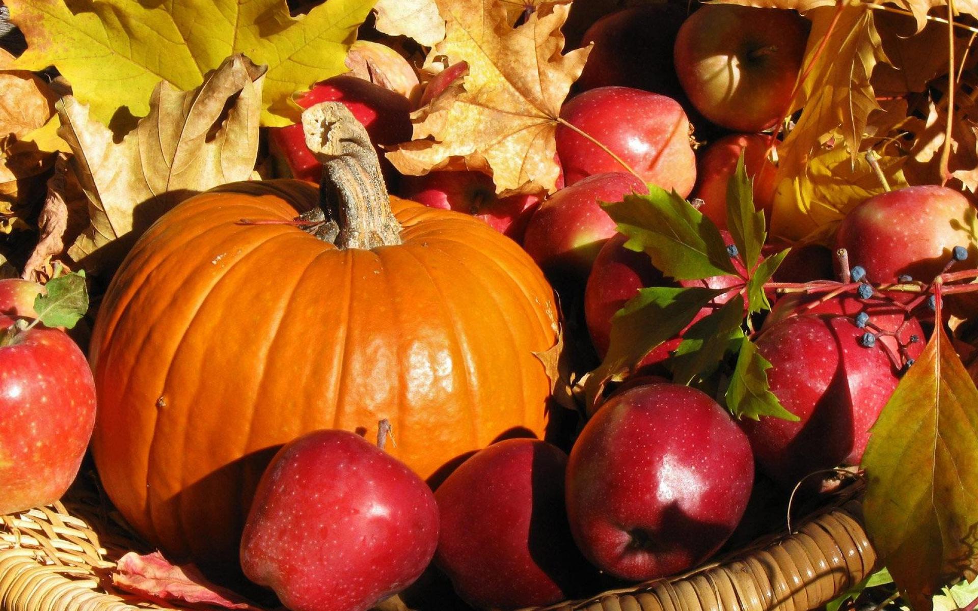 Description: A basket filled with apples and a pumpkin sitting on top of leaves and leaves on the ground next to it.