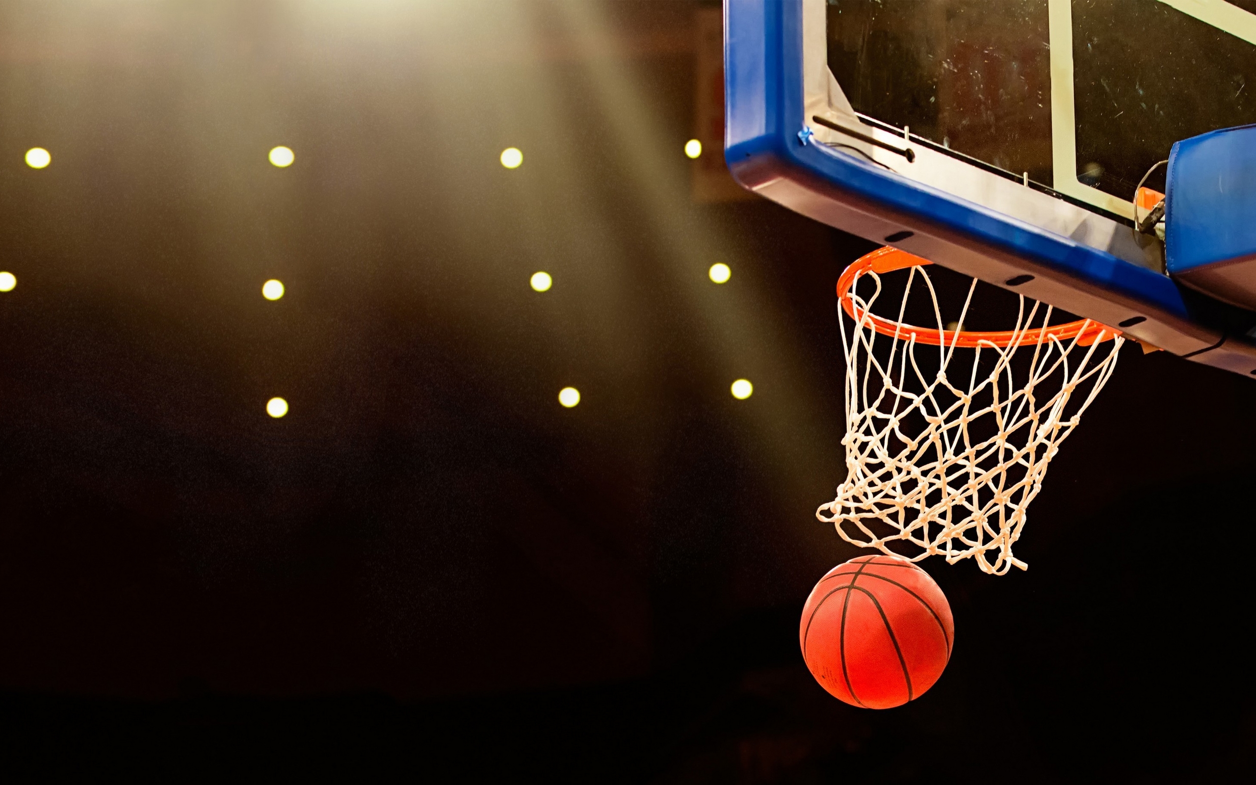 Description: A basketball is in the air near a basketball hoop with lights on it and a basketball in the air.