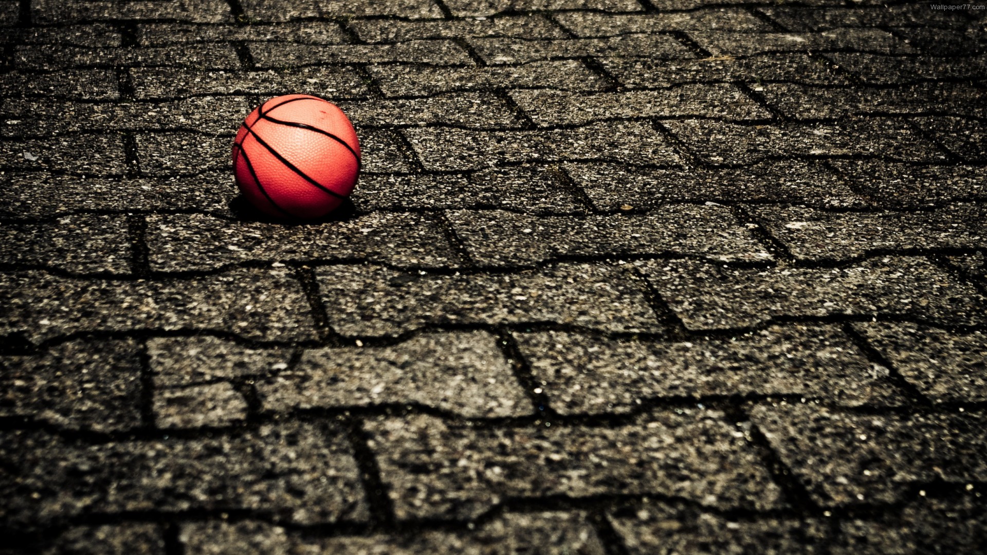 Description: A basketball laying on the ground on a brick road with a shadow of a basketball on the ground and a basketball in the middle.