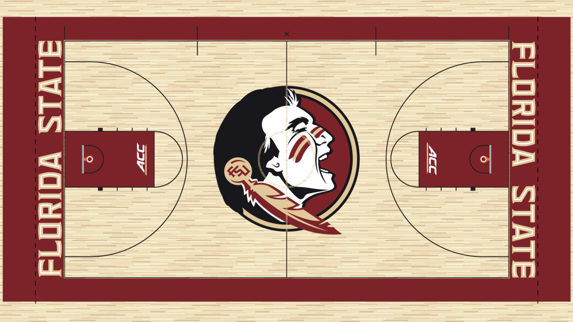 Description: A basketball court with a basketball on it and a basketball on the floor with a face of florida state.