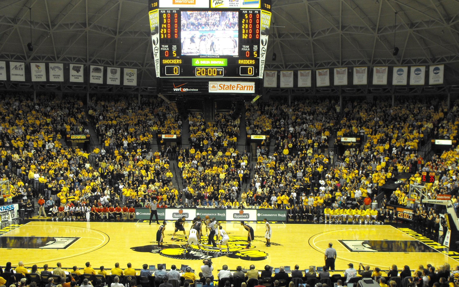 Description: A basketball court with a large crowd of people watching it from the stands and a big screen in the center.