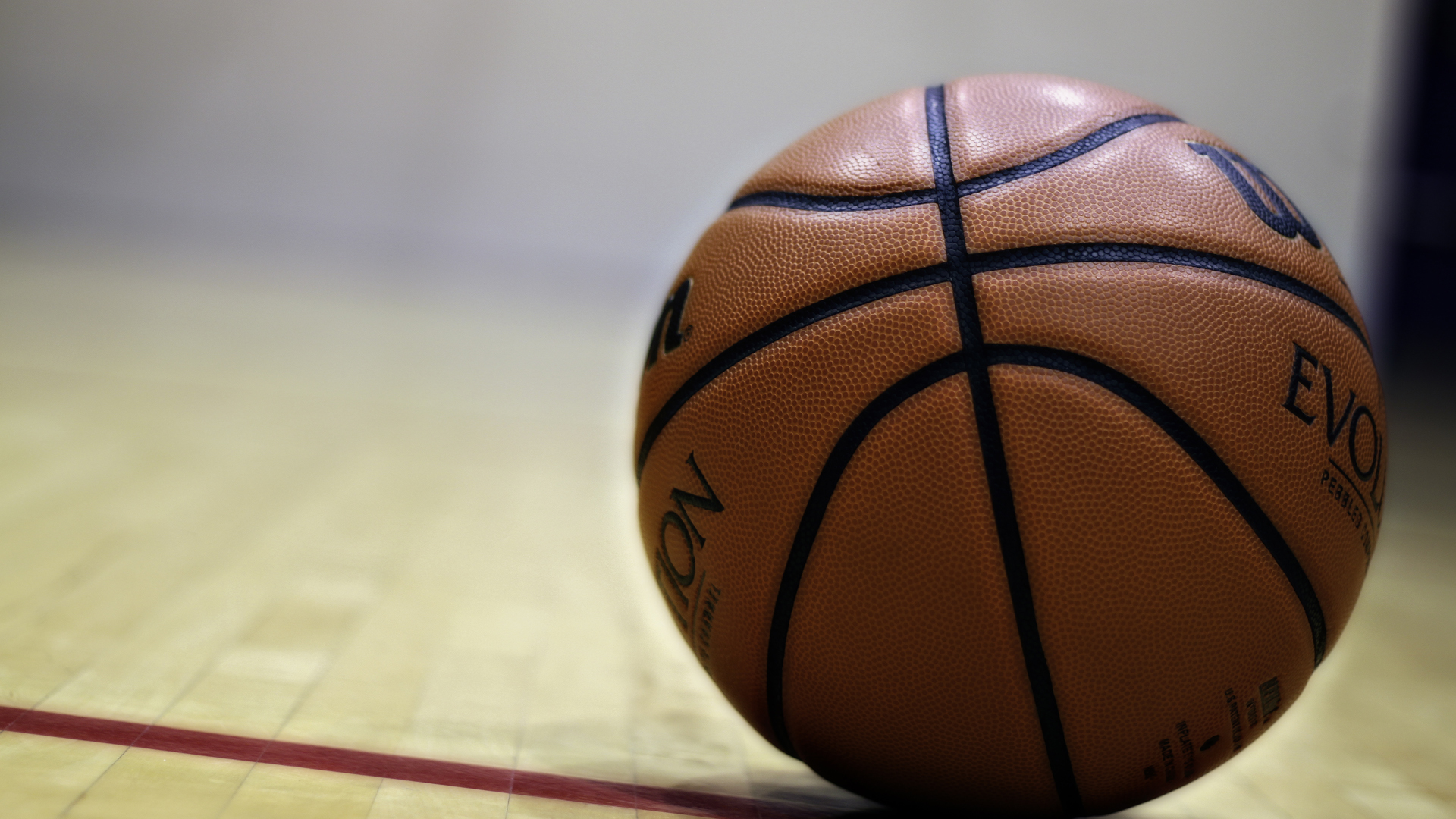 Description: A basketball sitting on a basketball court with a red line on the floor next to it and a white wall behind it.