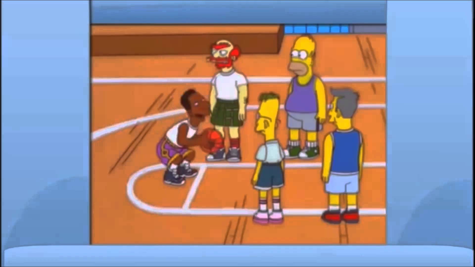 Description: A cartoon of a basketball game with a group of people watching it on the court and a man holding a basketball.