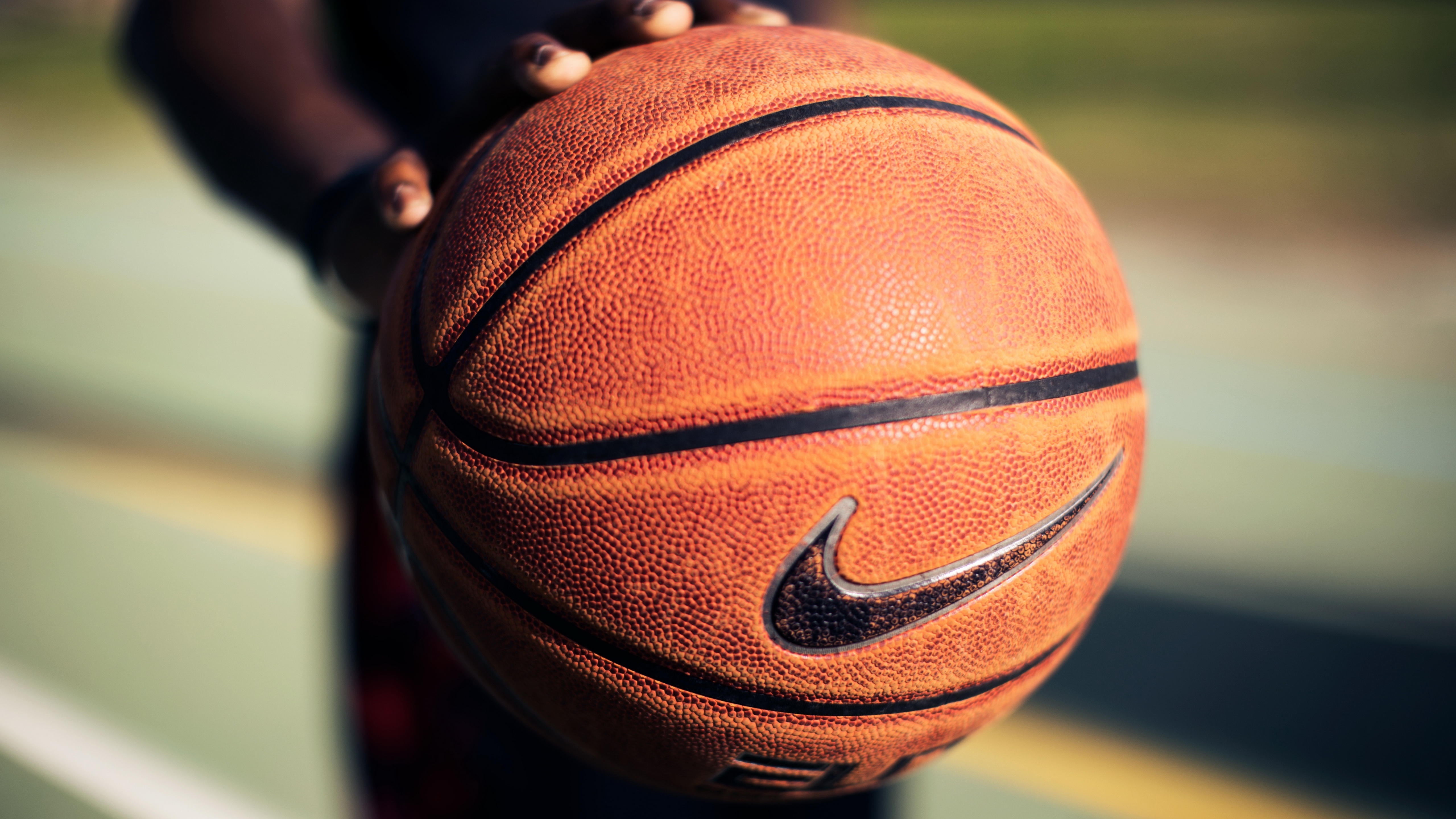 Description: A basketball is held by a person with a nike ball on their arm and a nike logo on the basketball.