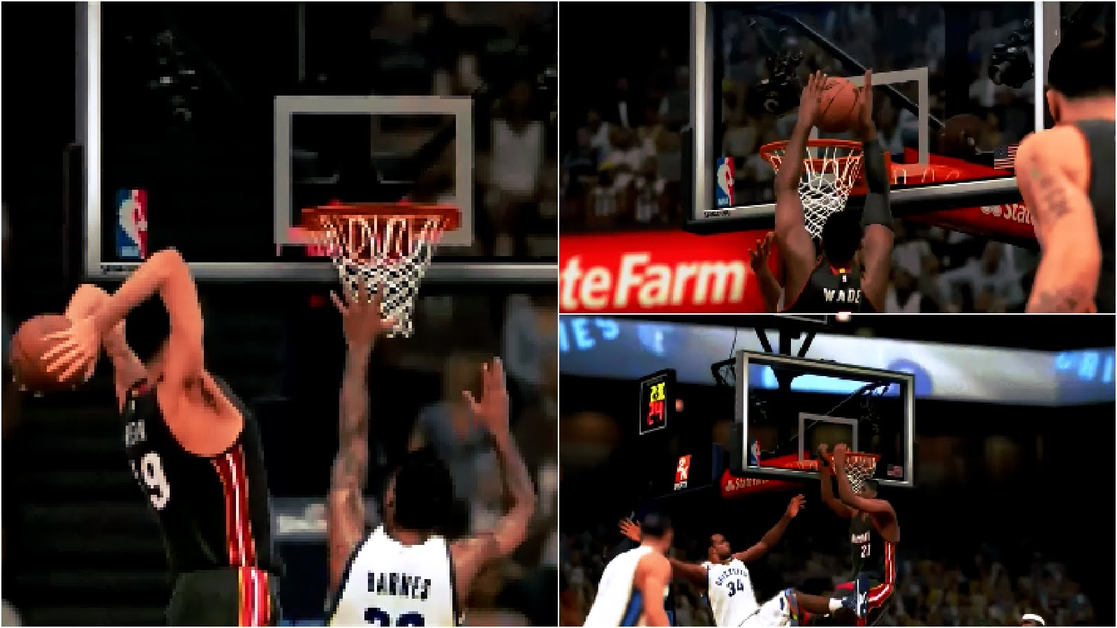 Description: A collage of photos of a basketball player dunking a basketball in a game of basketball with a referee.