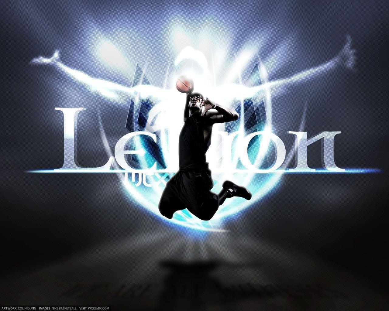 Description: A basketball player jumping up into the air with a ball in his hand and the word lebron on the background.