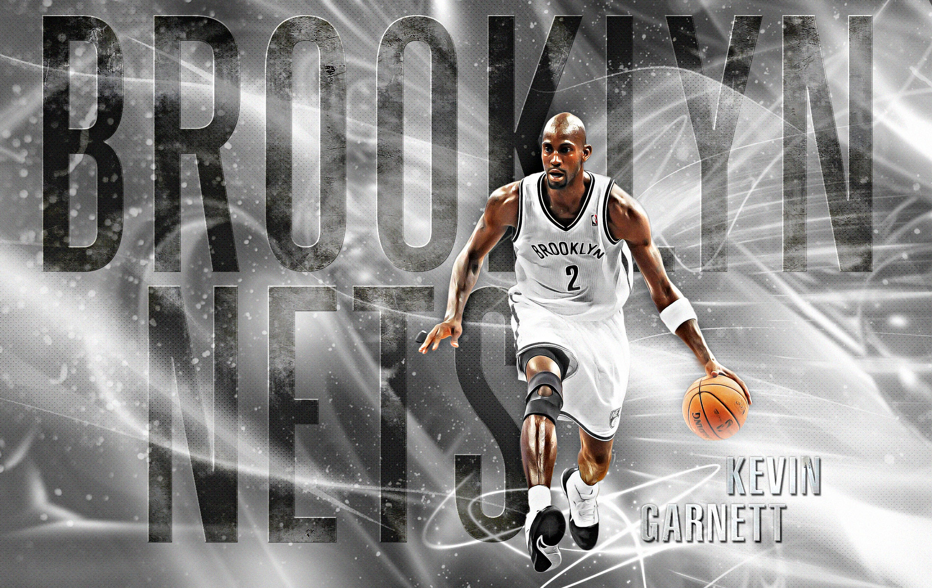 Description: A basketball player is running with a ball in his hand and the words brooklyn nets are in the background.