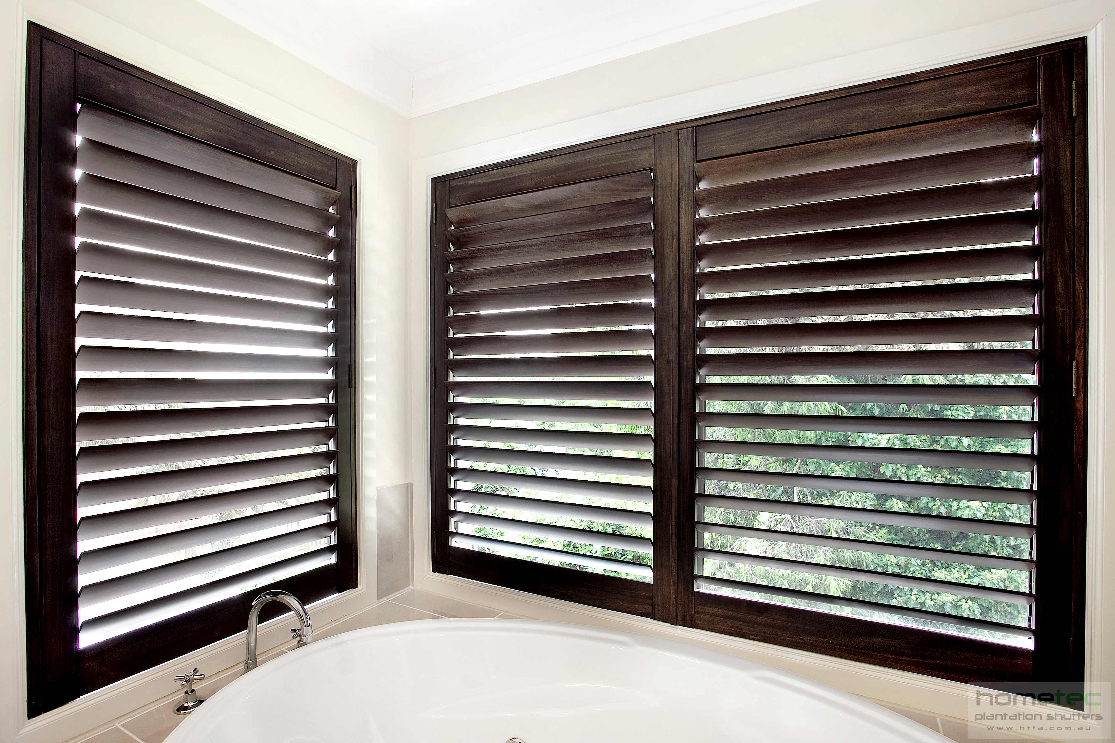 Description: A bath tub sitting next to two windows with wooden blinds on them in a bathroom next to a window.