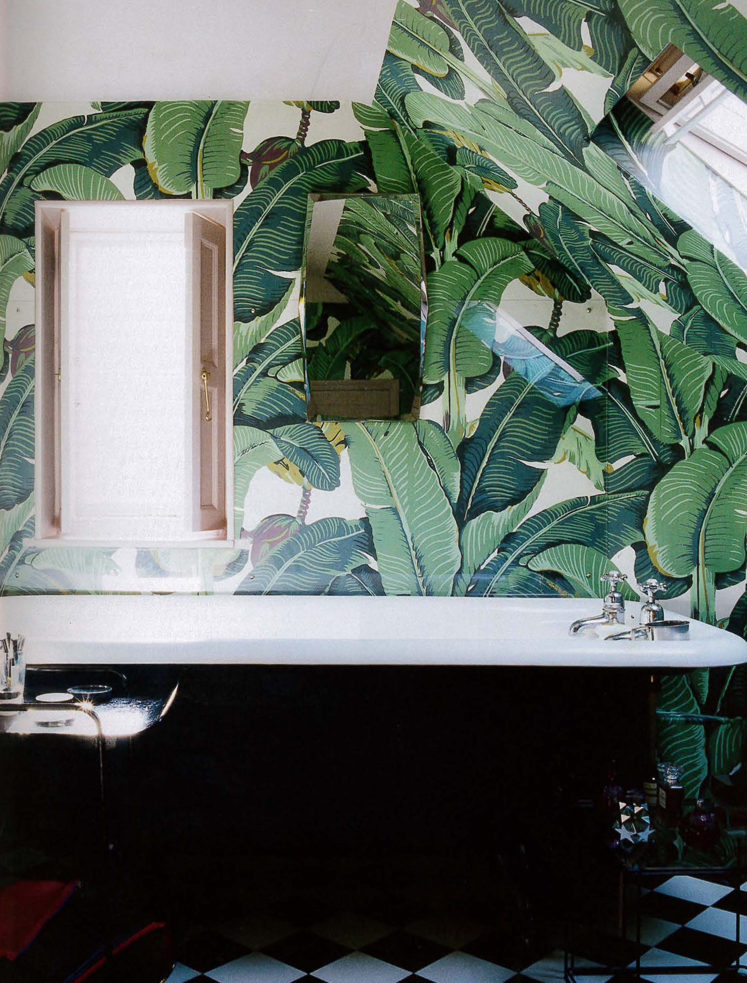 Description: A bathroom with a bathtub and a mirror on the wall and a wallpapered wall behind it.