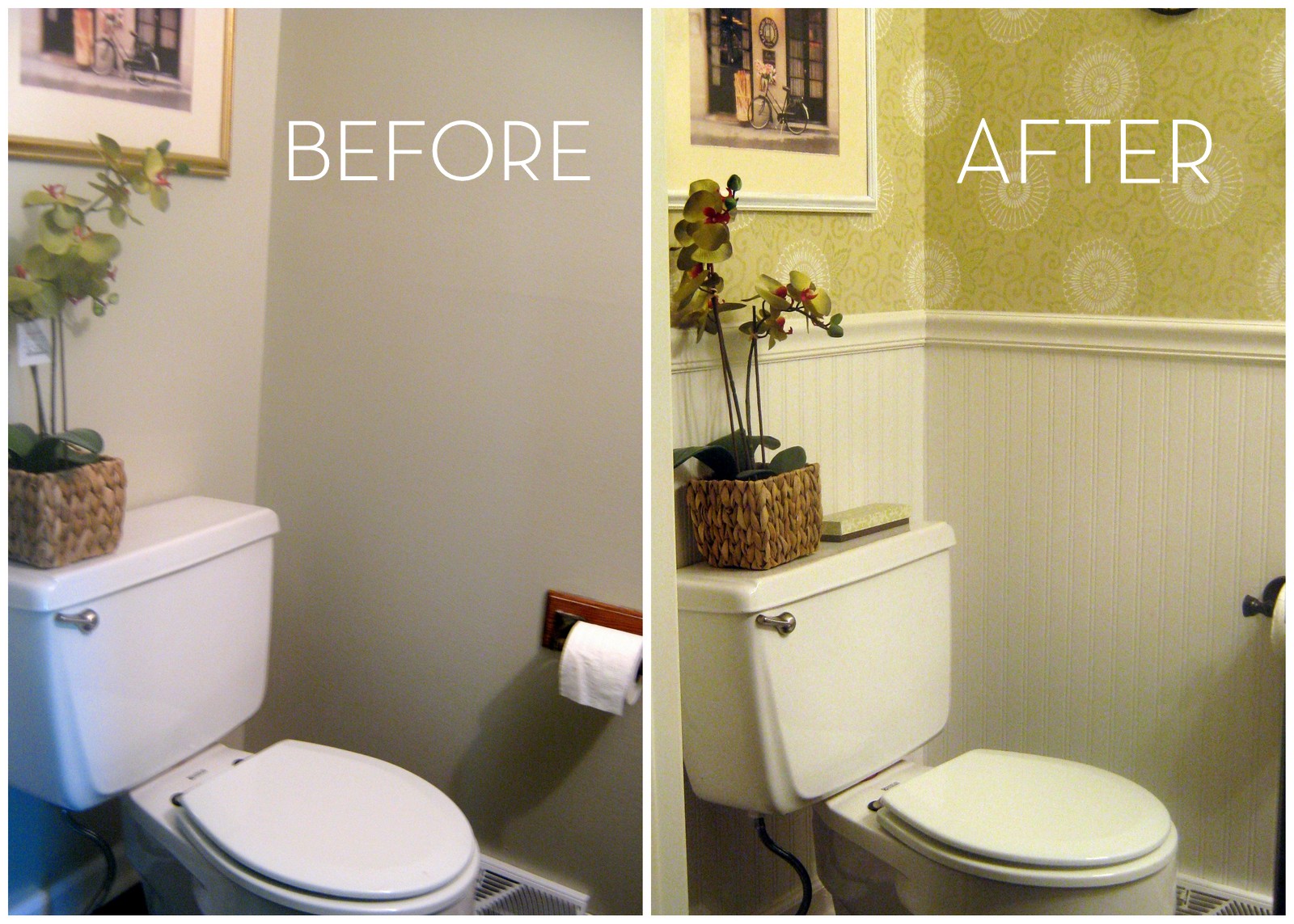 Description: A bathroom with a toilet and a sink before and after it is cleaned and cleaned with a new toilet seat cover.