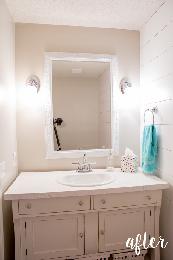 Description: A bathroom with a sink and a mirror above it and a towel on the rack in front of the sink.