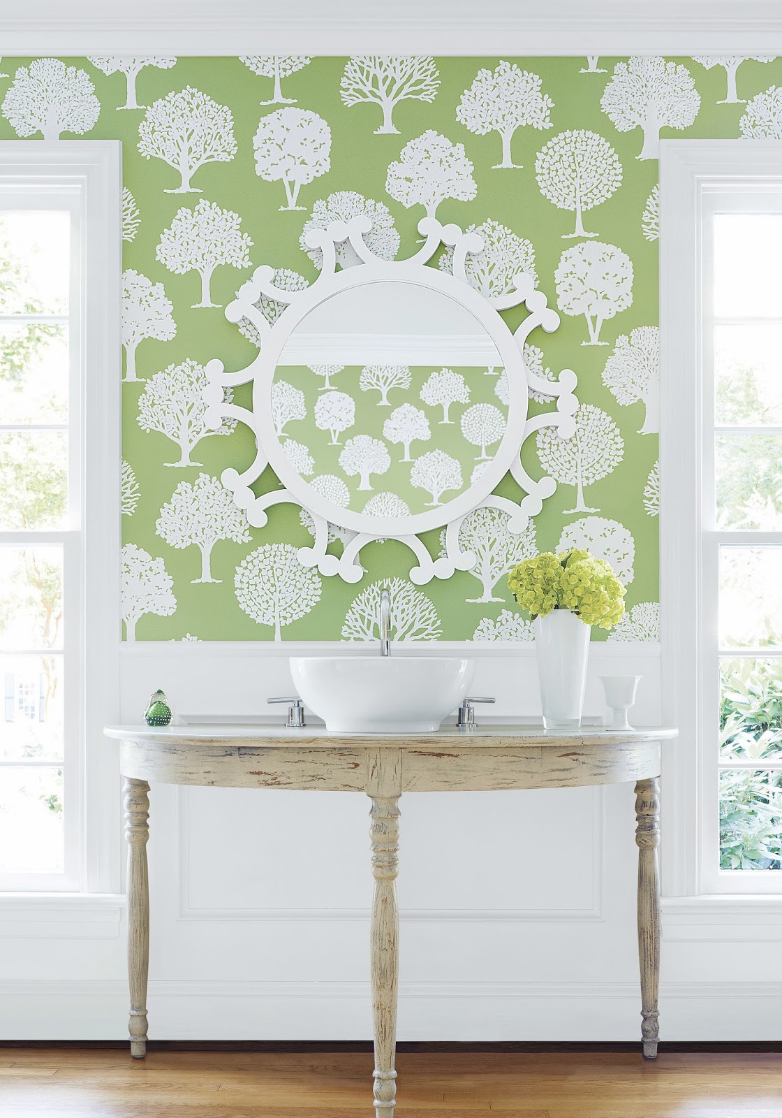 Description: A bathroom with a sink and a mirror on the wall and a wall paper with trees on it and a vase with flowers.