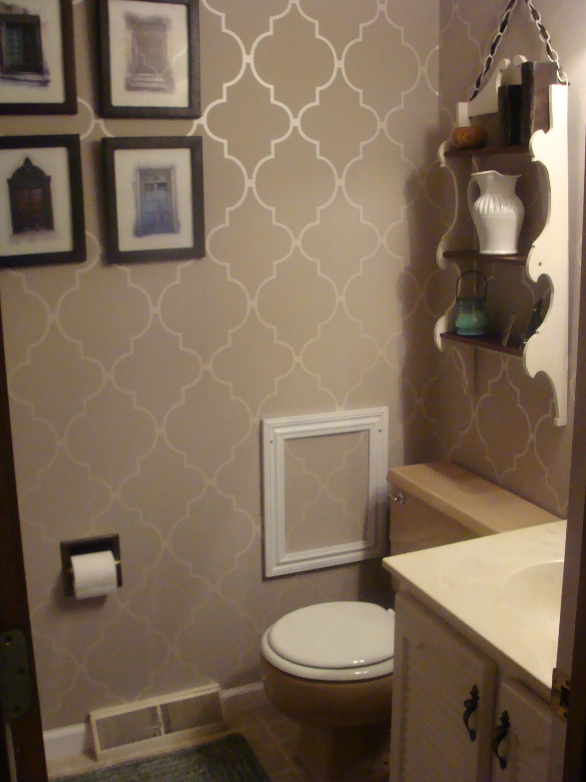 Description: A bathroom with a toilet and a sink and a mirror with a shelf above it and pictures on the wall.