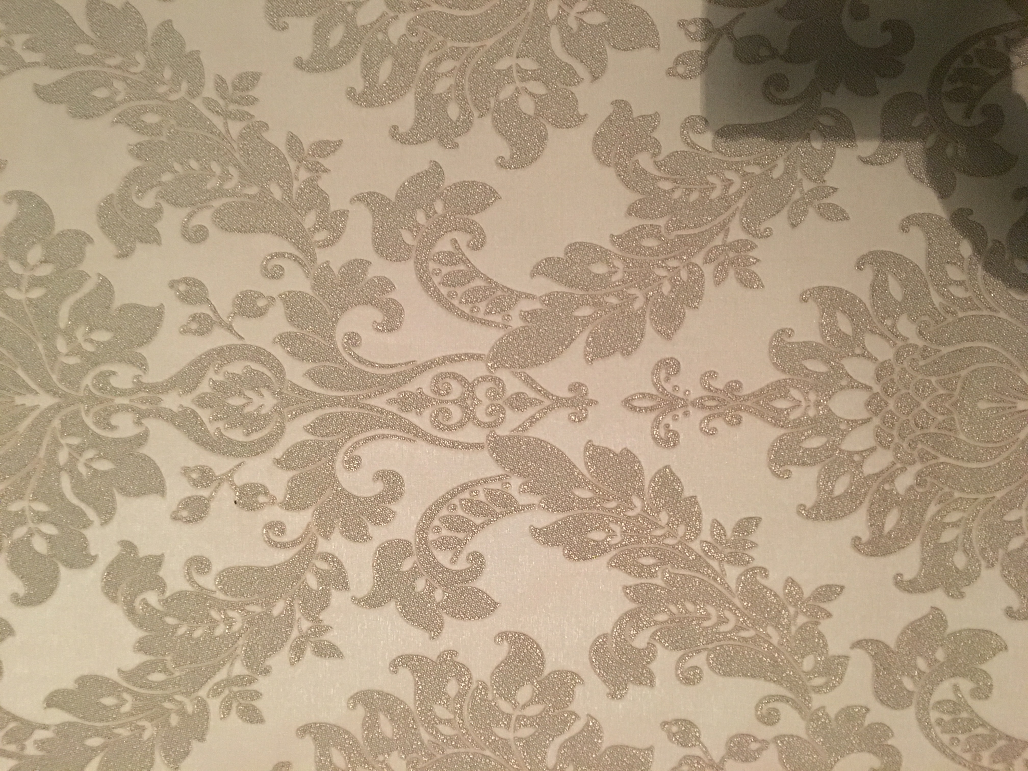 Description: A bathroom with a toilet and a wall paper with a pattern on it and a toilet paper roll in the corner.