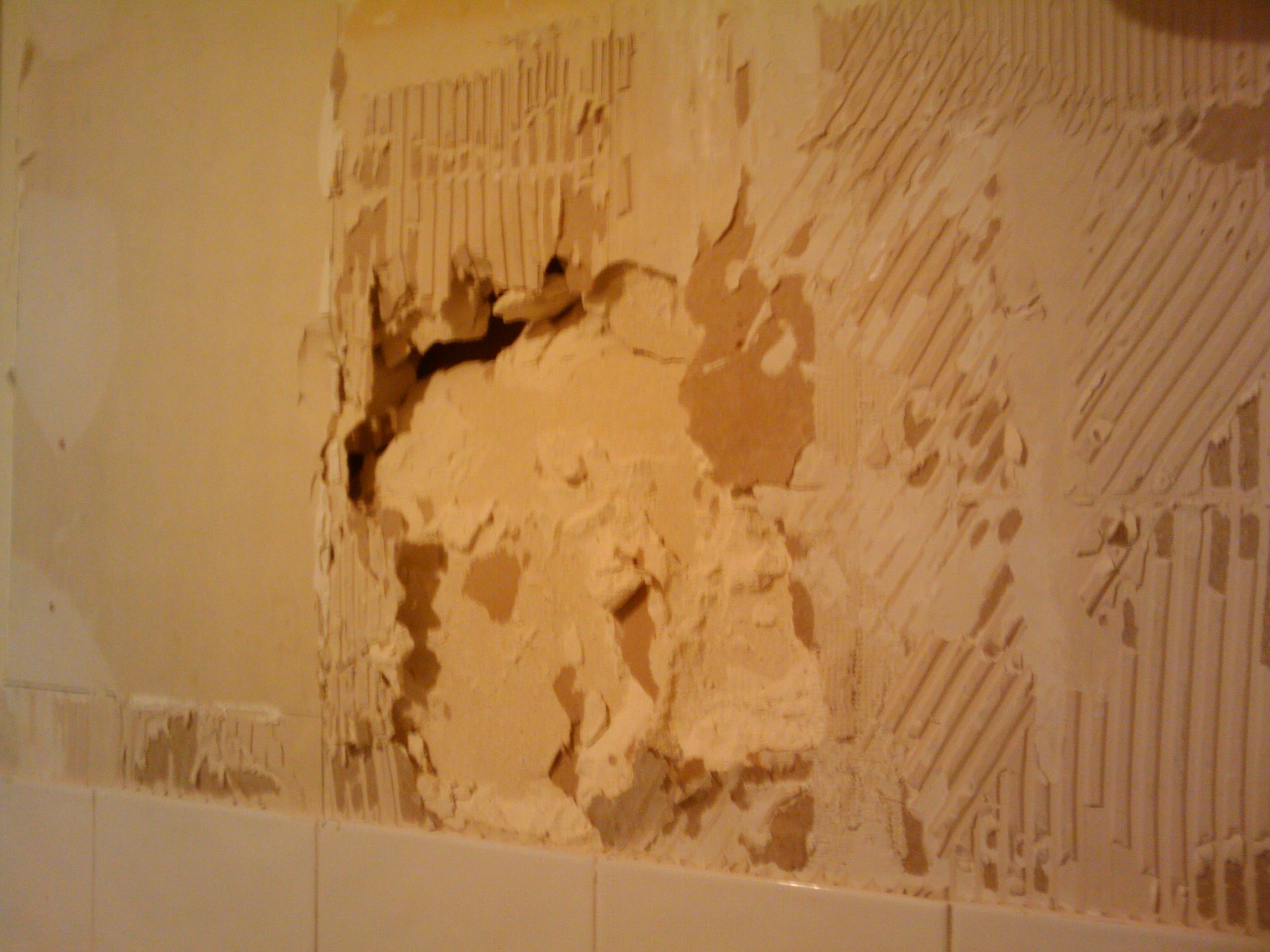Description: A bathroom wall with a hole in it and a tile wall with a hole in it and a white tiled wall.