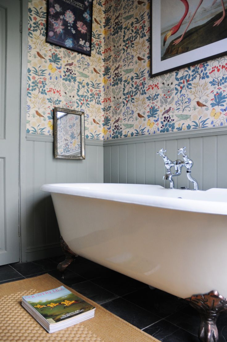 Description: A bathtub in a bathroom with a book on the floor next to it and a picture on the wall.