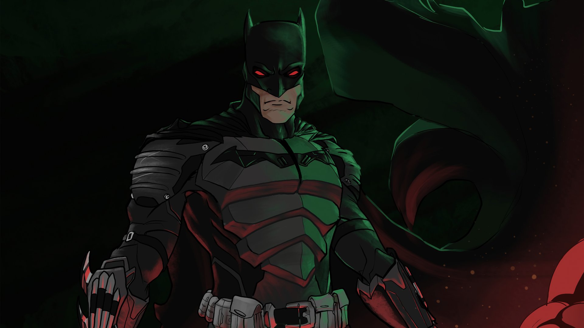 Description: A batman animated character standing in front of a bat symbol and a red background with a green and black background.